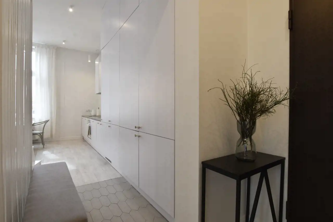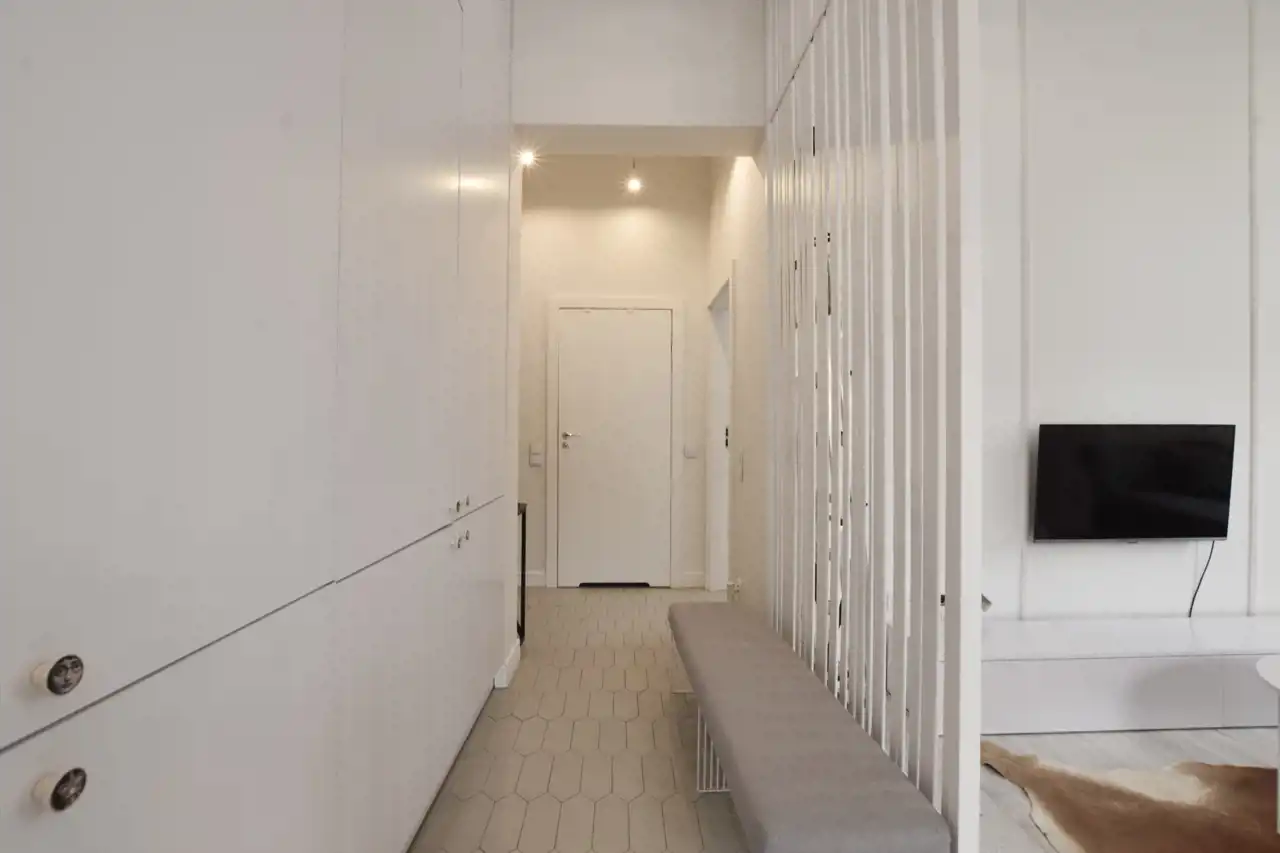 domofon, oświetlenie, komoda, ławka tapicerowana.