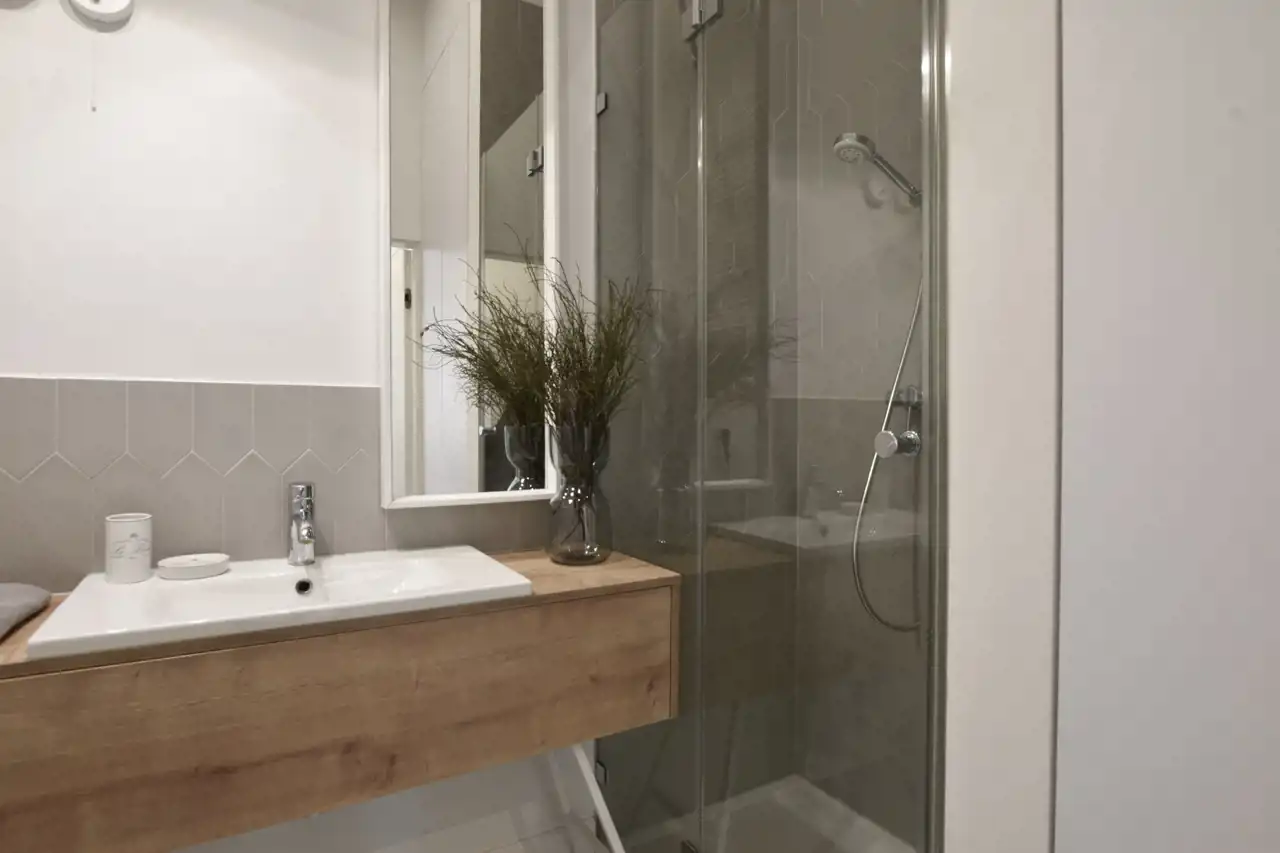 Łazienka z prysznicem, z zabudową meblową z miejscem do przechowywania, z pralką w zabudowie.