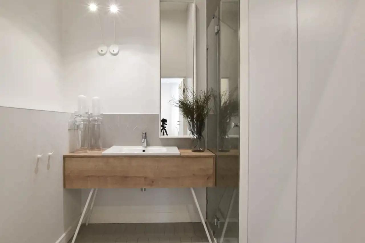 meble łazienkowe w zabudowie, umywalka nablatowa z baterią łazienkową Kludi, oświetlenie, lustro w ramie, WC z deską wolnoopadającą Roca, przycisk spłukujący Geberit, kabina prysznicowa szklana z brodzikiem, zestaw natryskowy, oświetlenie, pralka z zabudowie meblowej, akcesoria łazienkowe typu wieszaki, uchwyt na papier toaletowy mocowany do ściany, dozownik mydła itp.