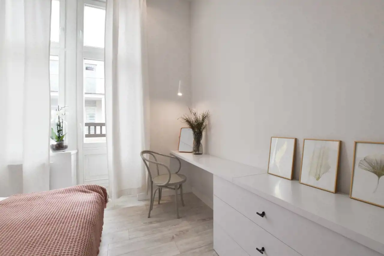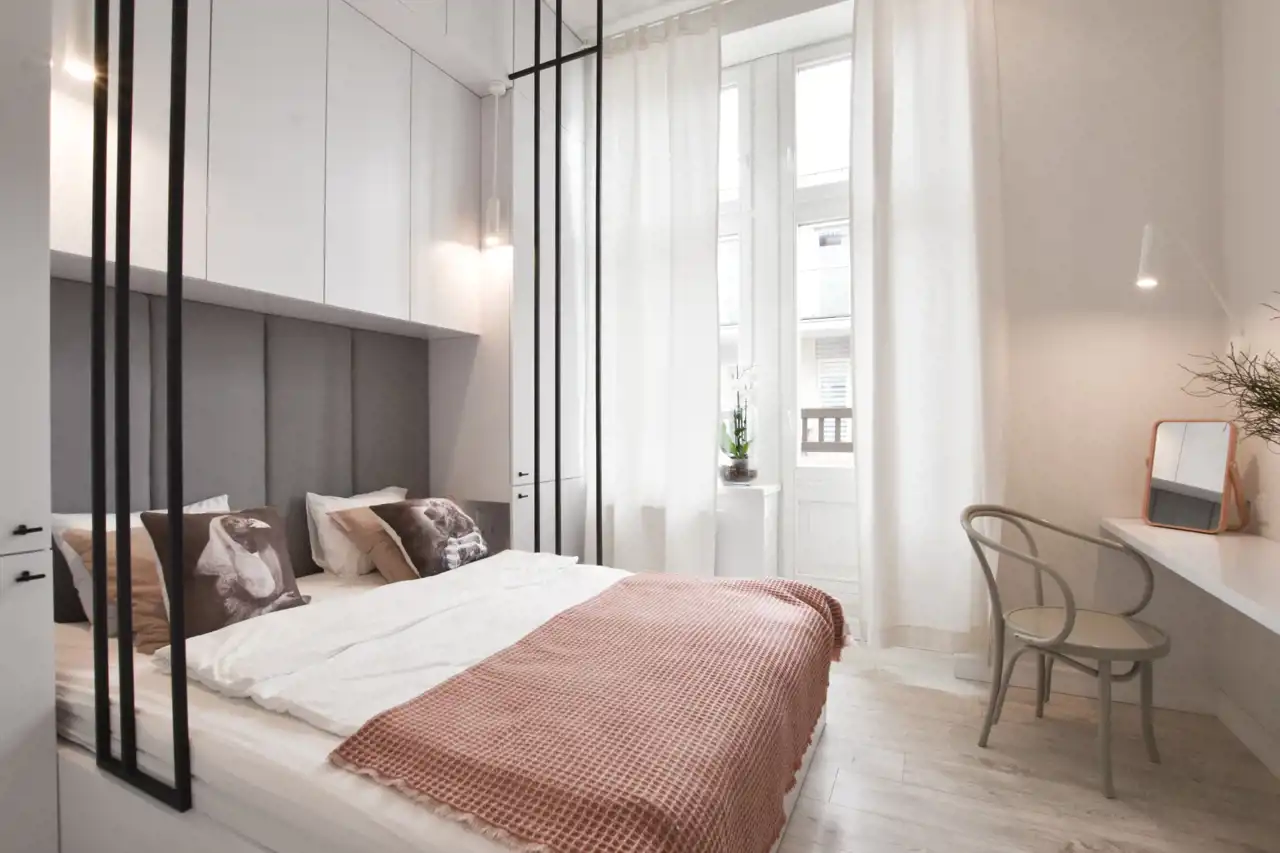 zabudowa meblowa, łóżko z materacem 160x200 z tapicerowanym zagłówkiem, oświetlenie, drobne wyposażenie typu pościel, koc, lustro czy zasłony.