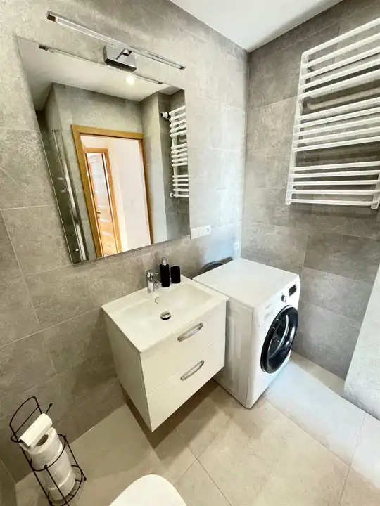 Mieszkanie posiada 2 niezależne pokoje, pokój z aneksem kuchennym. Kuchnia kompleksowo wyposażona. W łazience znajduje się pralka, kabina prysznicowa oraz umywalka, wc. Jeden pokój posiada przestronny balkon.