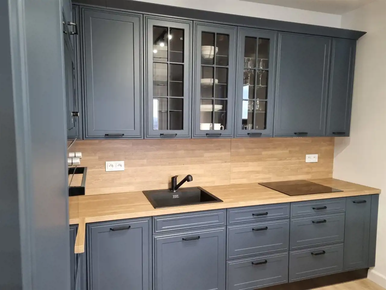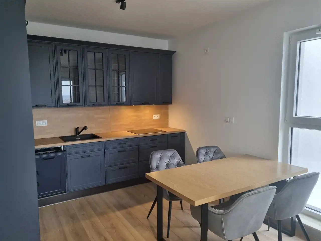 - meble na wymiar, zmywarka, duża lodówka, piekarnik, płyta indykcyjna, kuchenka mikrofalowa,