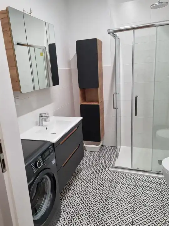 - łazienka z kabina prysznicową, pralka