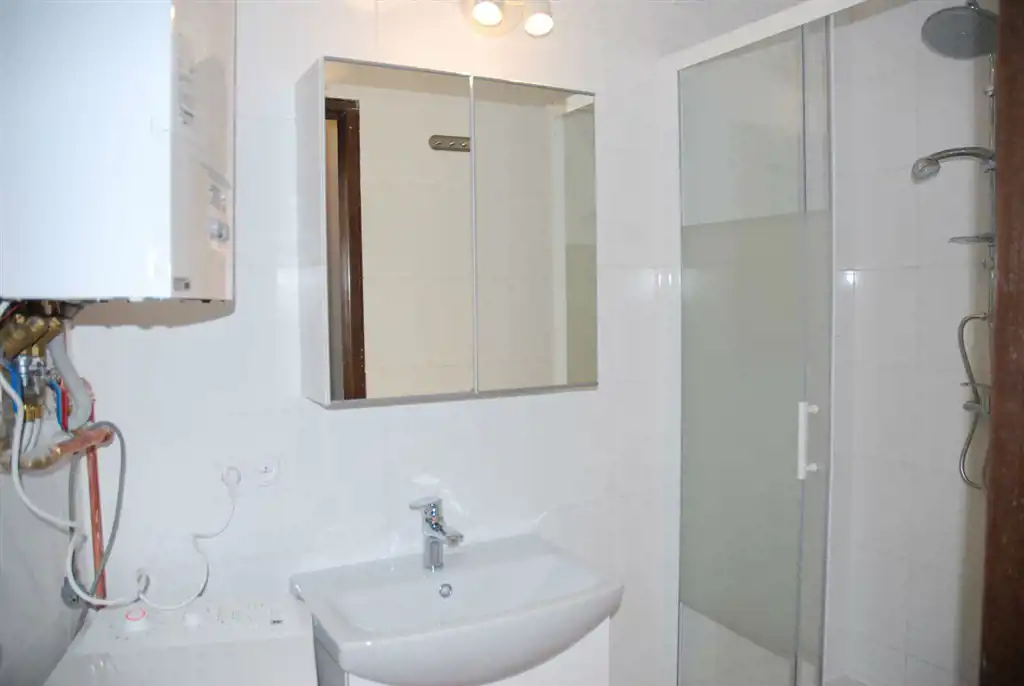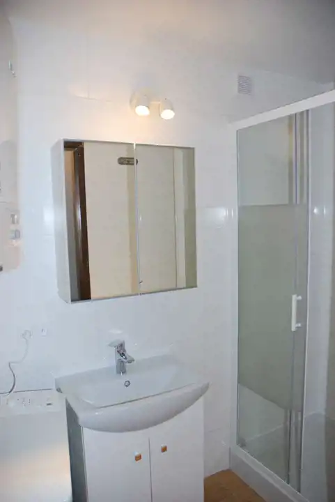 - w łazience duża kabina prysznicowa, umywalka i lustro, pralka, reflektorki.