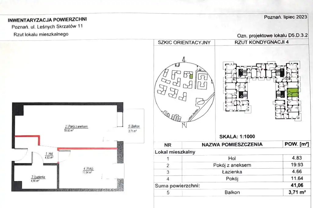 Lokal mieszkalny o powierzchni 41,06 m2 składa się z następujących pomieszczeń:
