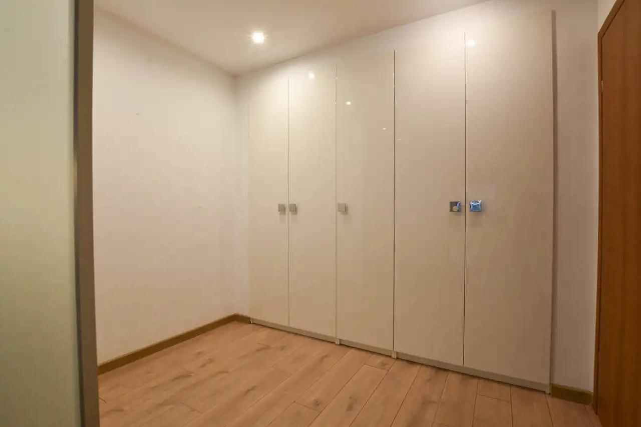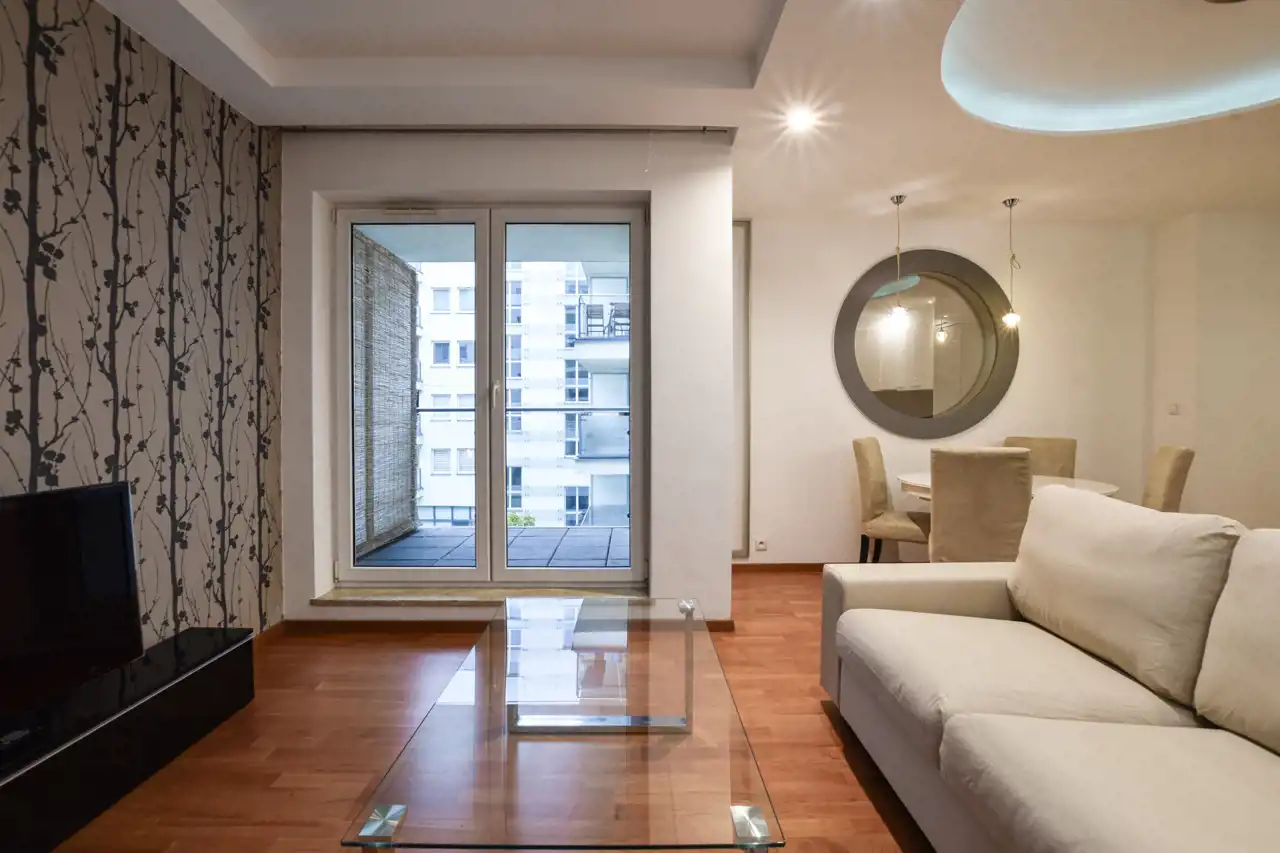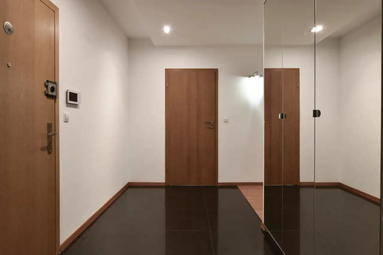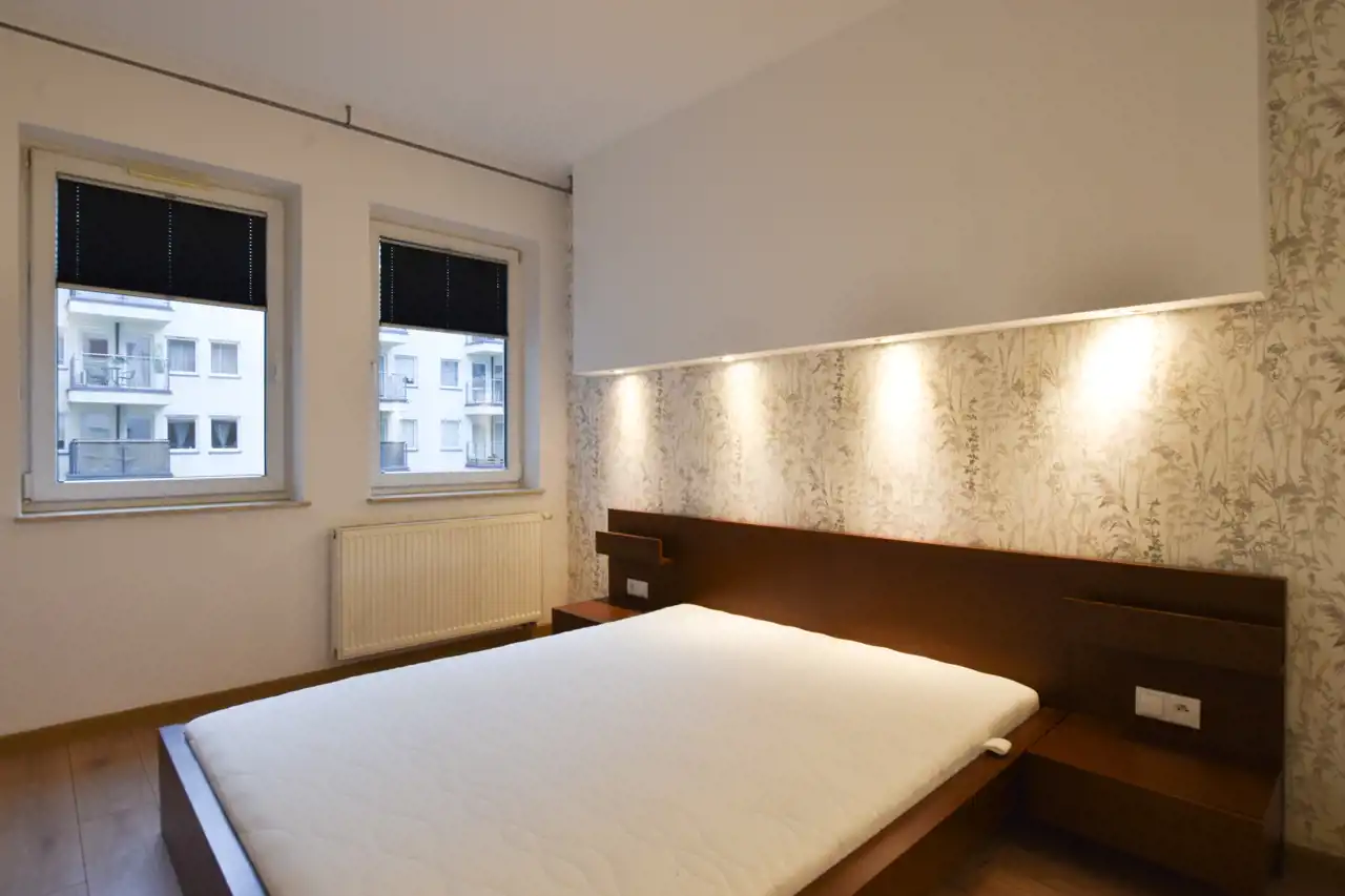 Mieszkanie składa się z przestronnego pokoju dziennego z aneksem kuchennym, części jadalnianej, funkcjonalnej łazienki z dużą wanną ze szklanym parawanem pełniącym funkcję prysznica. W części wypoczynkowej znajduje się sofa z szezlongiem (bez funkcji spania), stolik kawowy, telewizor, szafka rtv. Sypialnia wyposażona w łóżko 160x200 oraz szafy w zabudowie. W przedpokoju szafy do przechowywania odzieży wierzchniej, fronty szafy lustrzane.