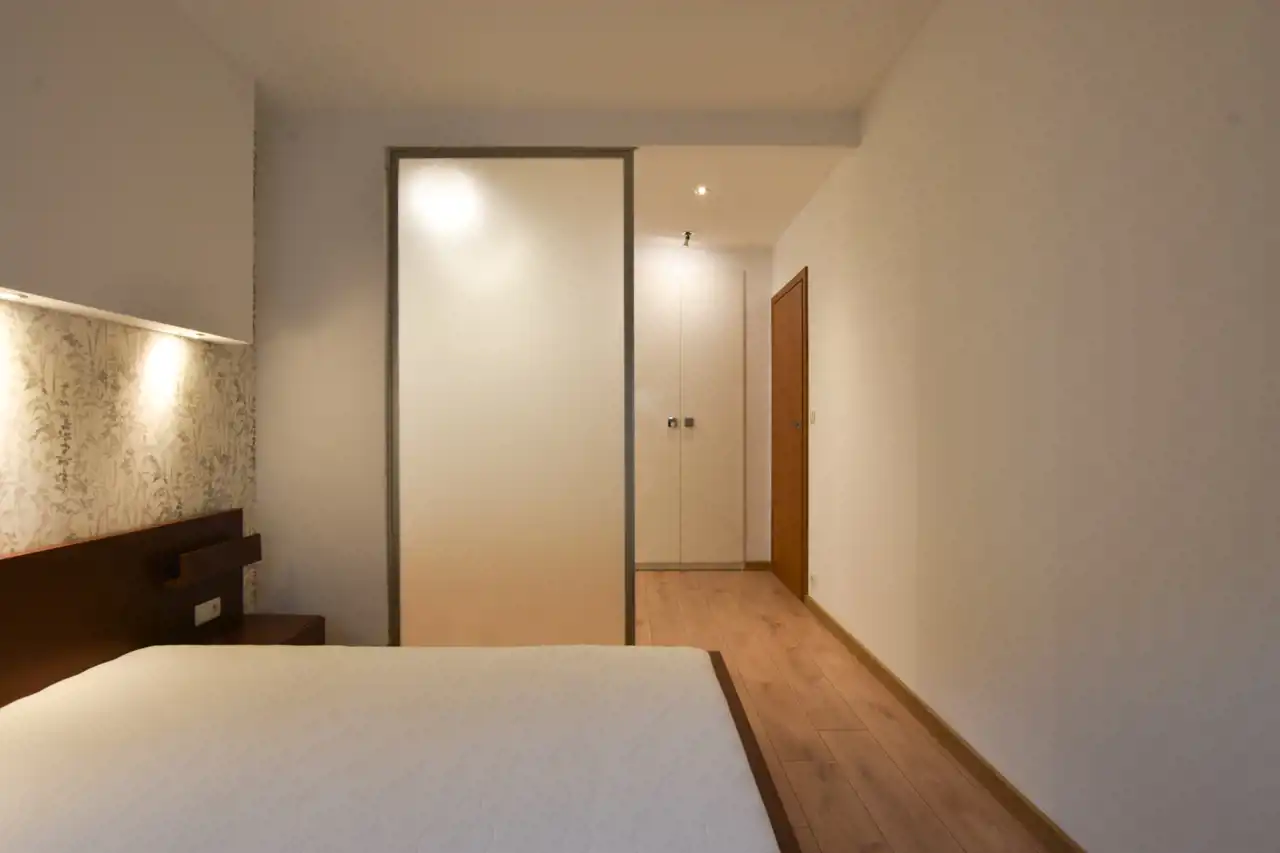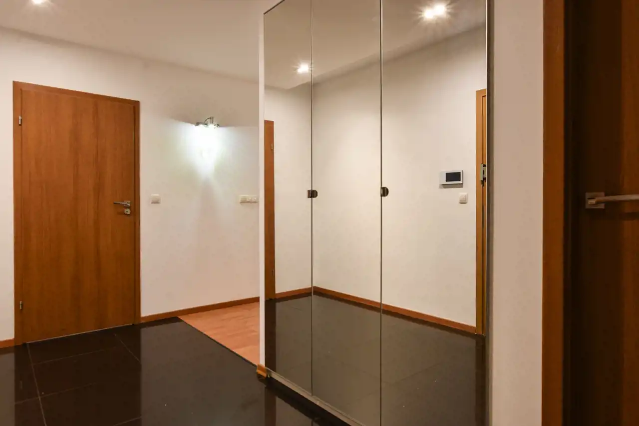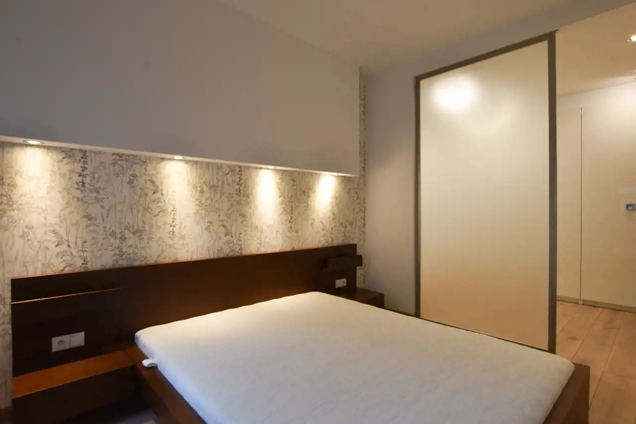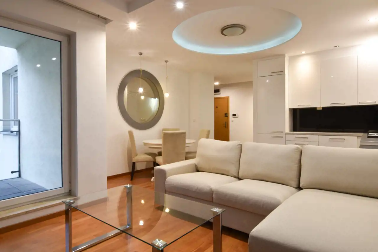 Mieszkanie składa się z przestronnego pokoju dziennego z aneksem kuchennym, części jadalnianej, funkcjonalnej łazienki z dużą wanną ze szklanym parawanem pełniącym funkcję prysznica. W części wypoczynkowej znajduje się sofa z szezlongiem (bez funkcji spania), stolik kawowy, telewizor, szafka rtv. Sypialnia wyposażona w łóżko 160x200 oraz szafy w zabudowie. W przedpokoju szafy do przechowywania odzieży wierzchniej, fronty szafy lustrzane.