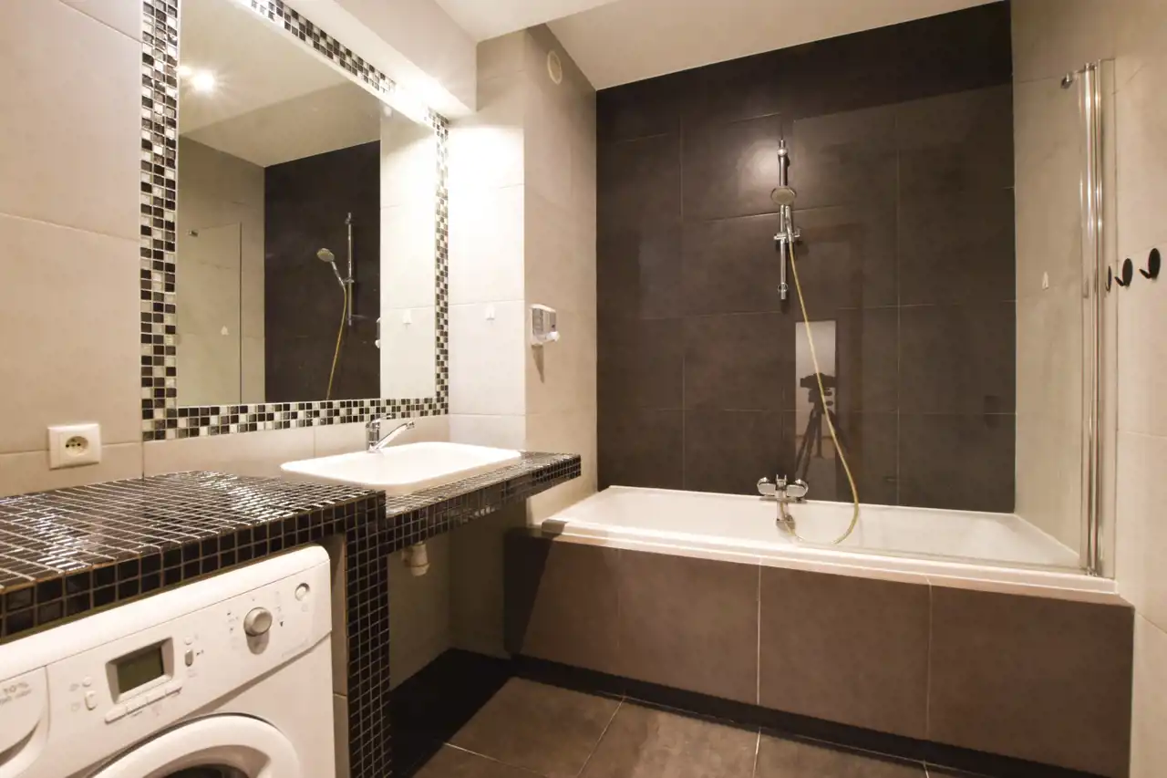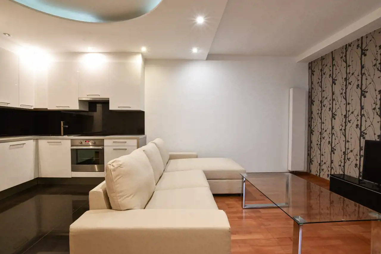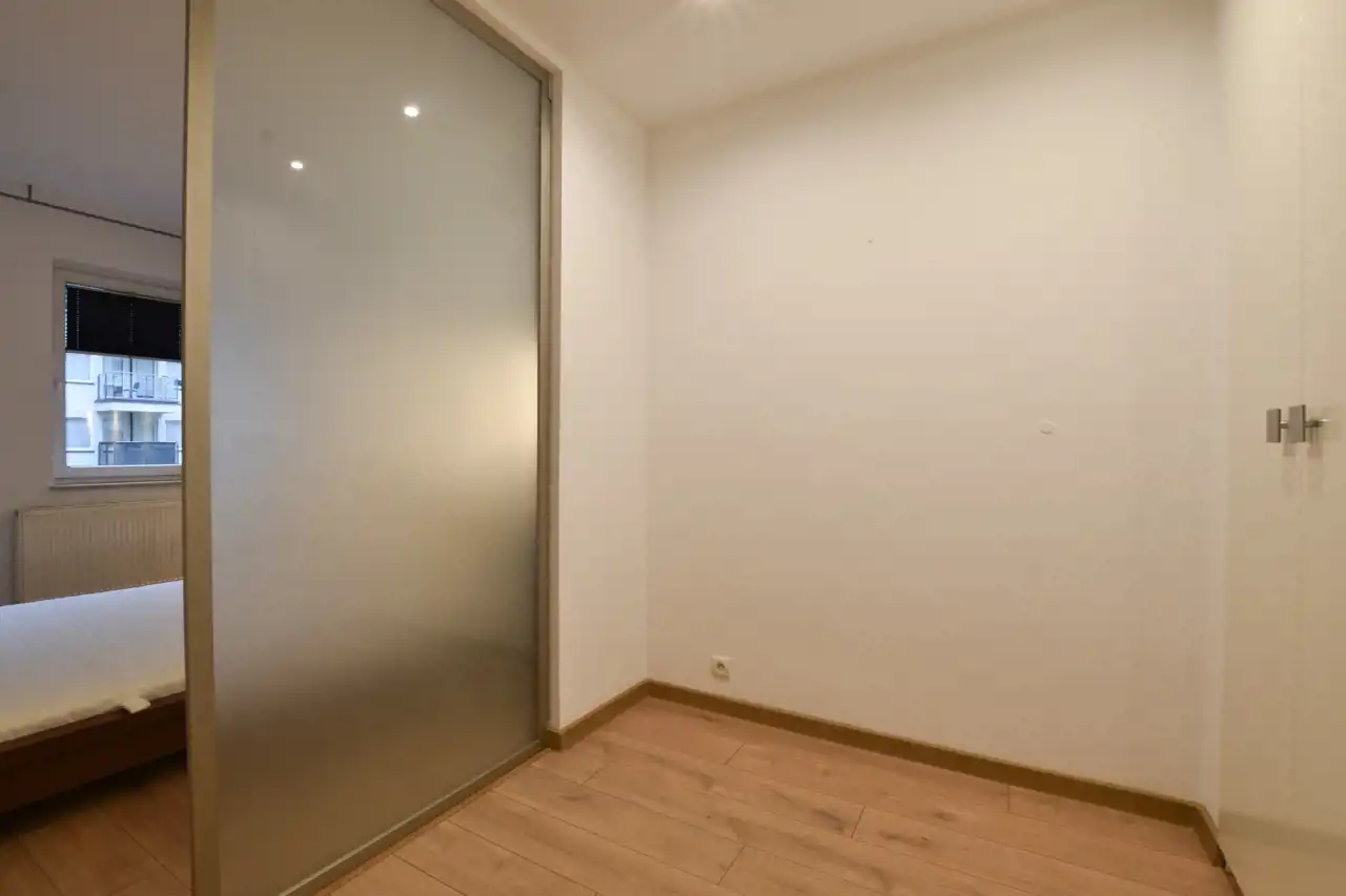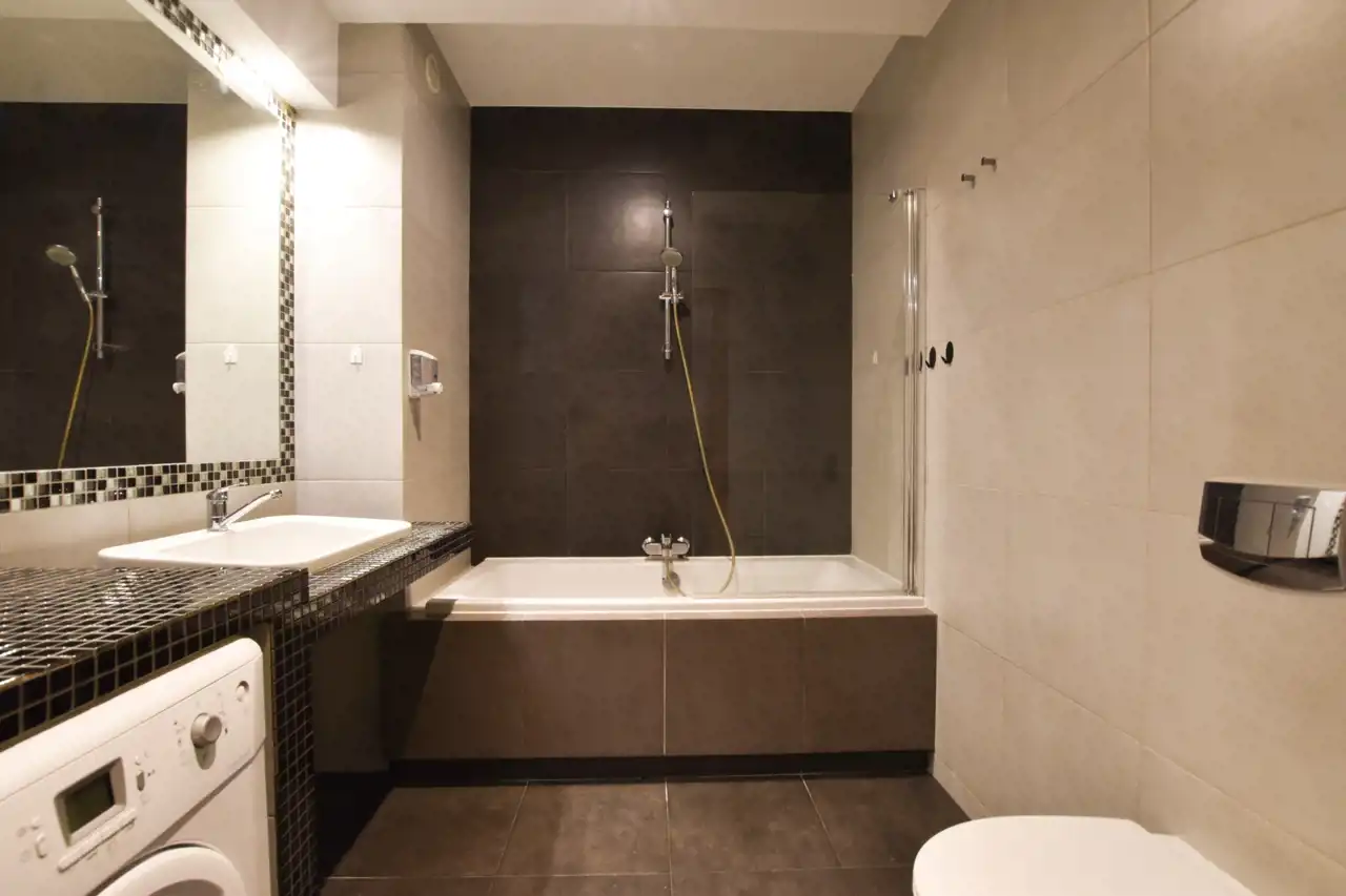 Mieszkanie składa się z przestronnego pokoju dziennego z aneksem kuchennym, części jadalnianej, funkcjonalnej łazienki z dużą wanną ze szklanym parawanem pełniącym funkcję prysznica. W części wypoczynkowej znajduje się sofa z szezlongiem (bez funkcji spania), stolik kawowy, telewizor, szafka rtv. Sypialnia wyposażona w łóżko 160x200 oraz szafy w zabudowie. W przedpokoju szafy do przechowywania odzieży wierzchniej, fronty szafy lustrzane.