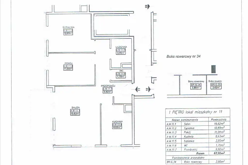 Lokal mieszkalny o powierzchni 67,55 m2 składa się z następujących pomieszczeń: