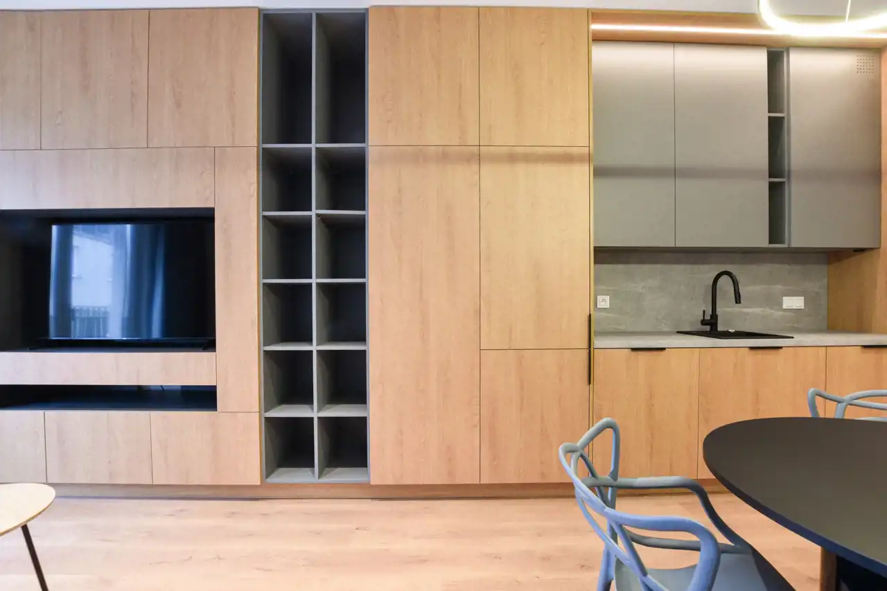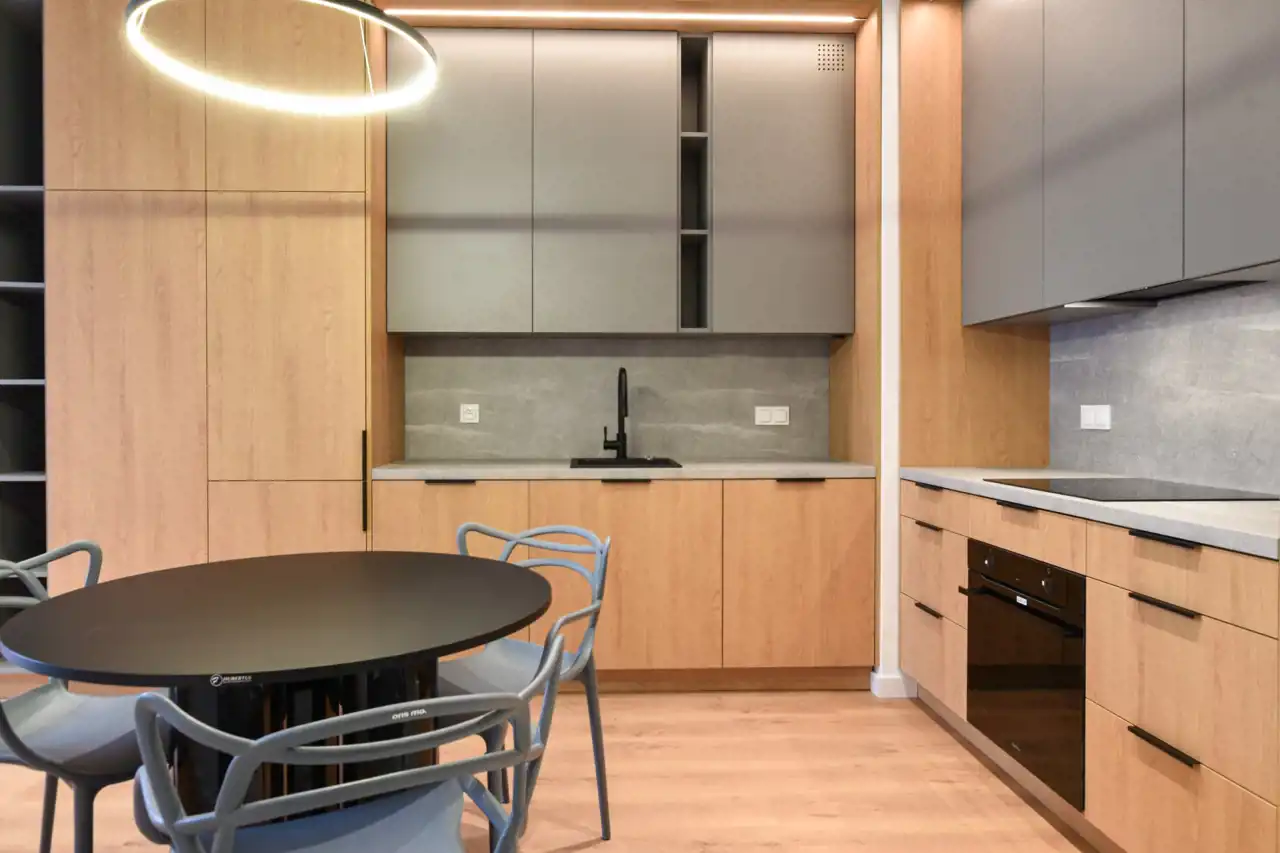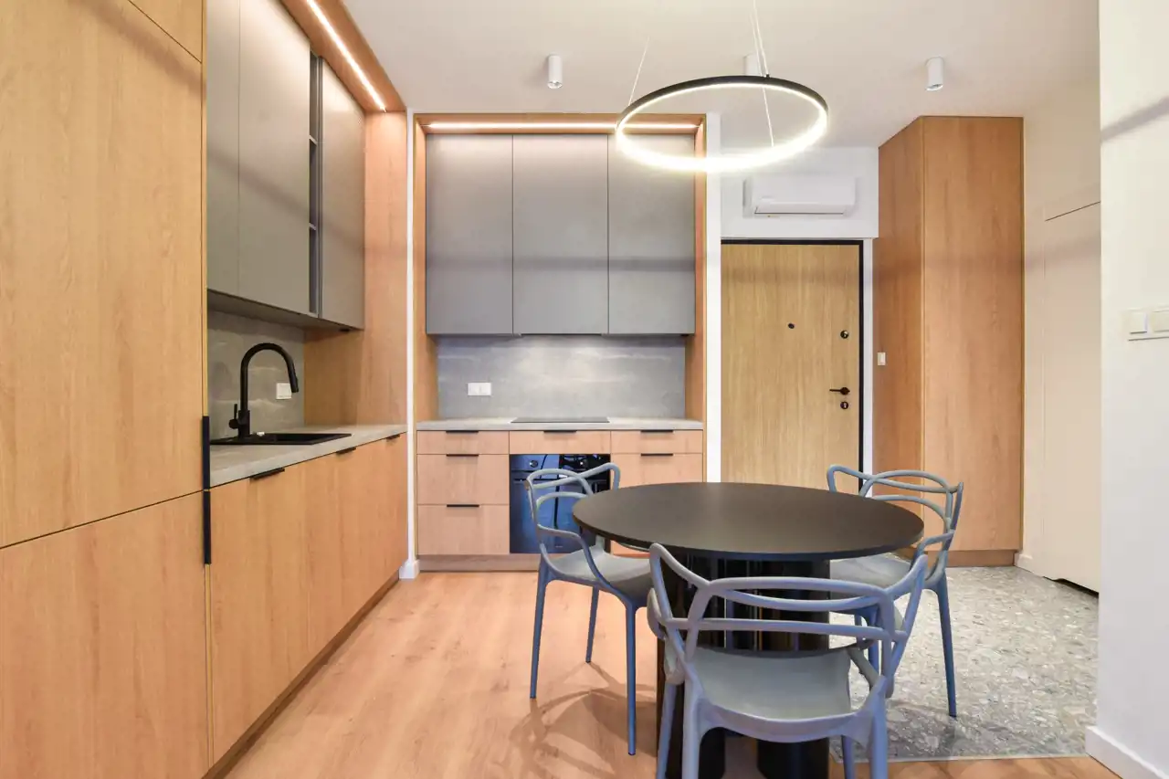 aneks kuchenny z meblami kuchennymi w zabudowie, sprzętem AGD w zabudowie;