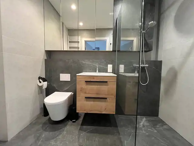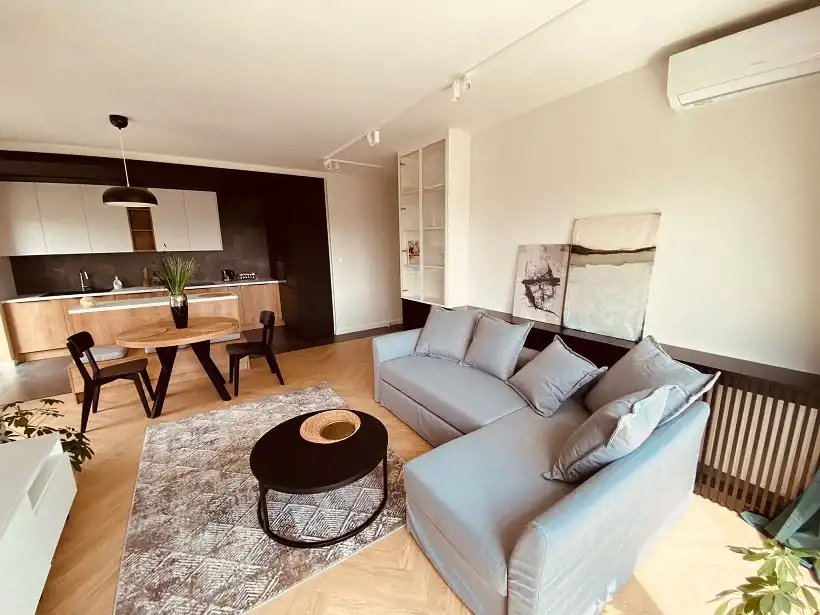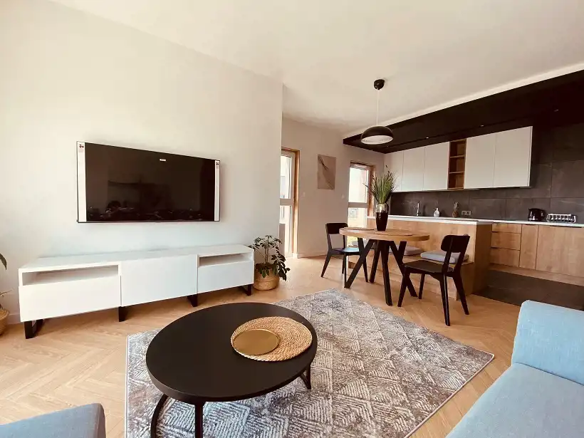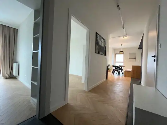 Wnętrze składa się z dwóch sypialni, salonu z aneksem kuchennym, łazienki oraz przedpokoju. Mieszkanie jest w pełni umeblowane i wyposażone (z wyjątkiem jednej sypialni).