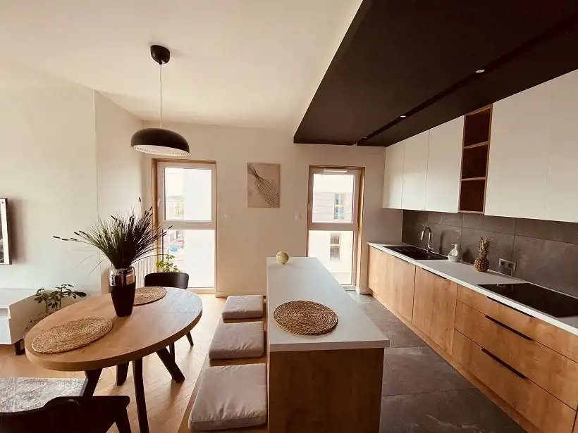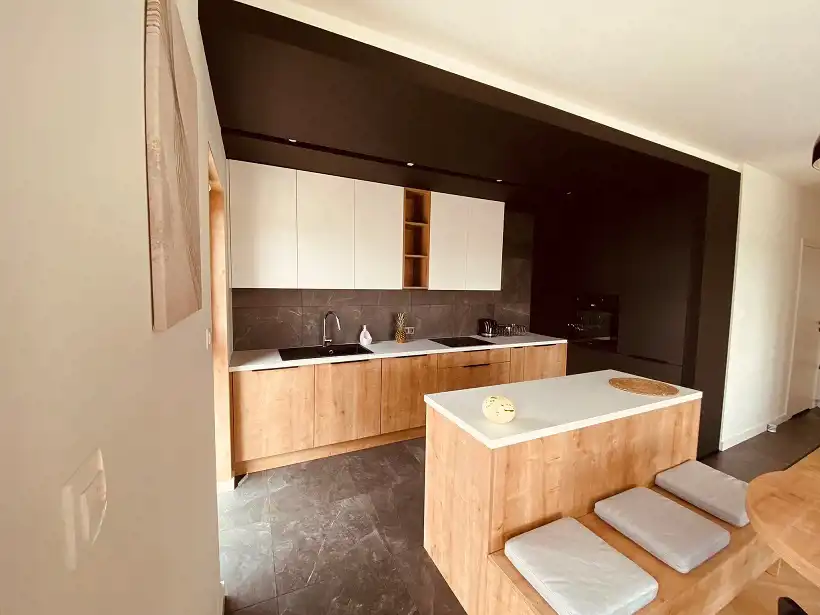 Aneks kuchenny: nowoczesna zabudowa z wyspą i dużą powierzchnią roboczą. Na wyposażeniu: płyta indukcyjna, pochłaniacz, zmywarka, lodówka, piekarnik.