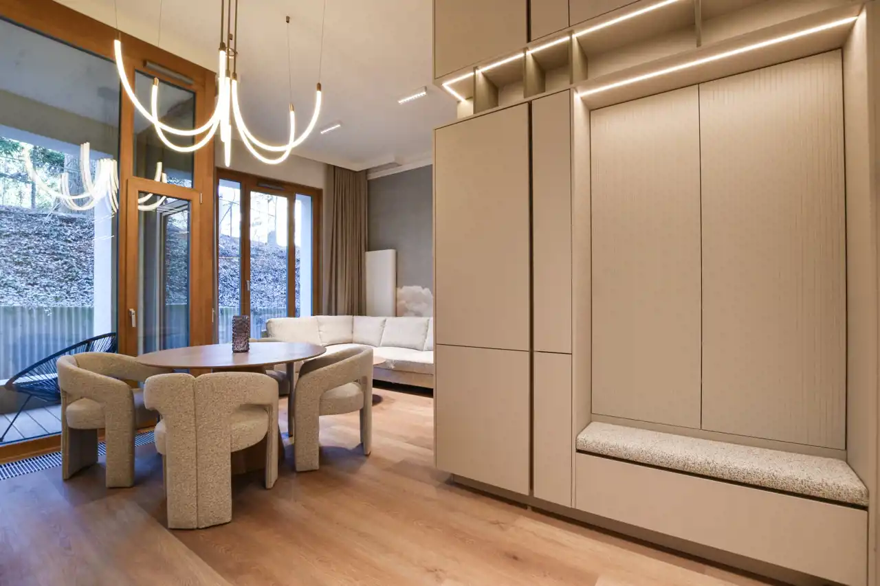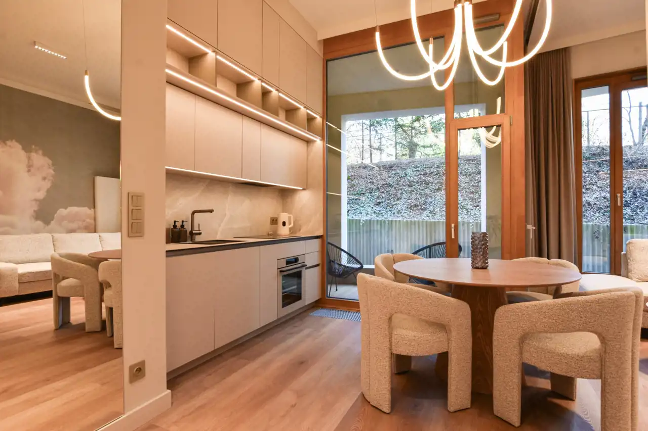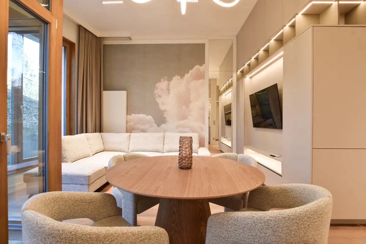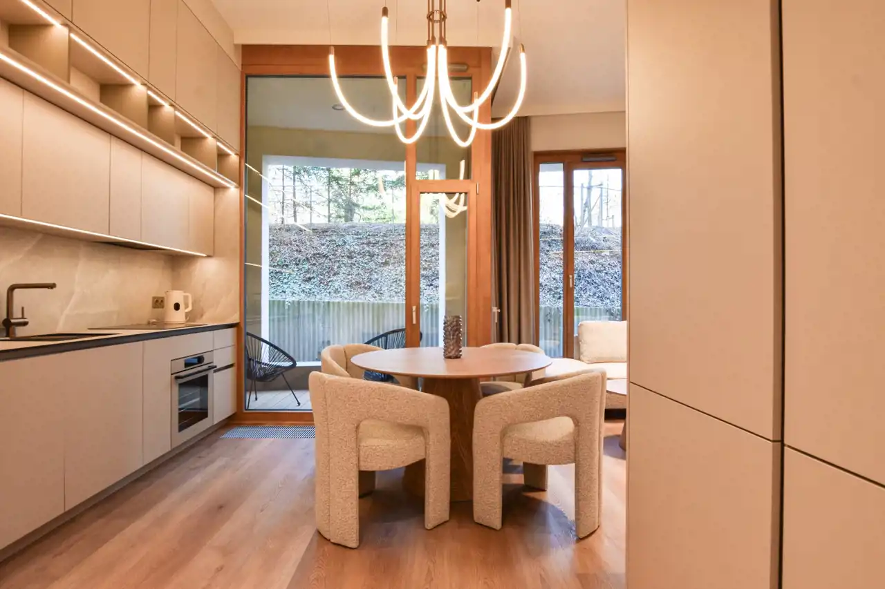 - 4 osobowy okrągły stół z tapicerowanymi krzesłami wraz z oryginalnym oświetleniem;