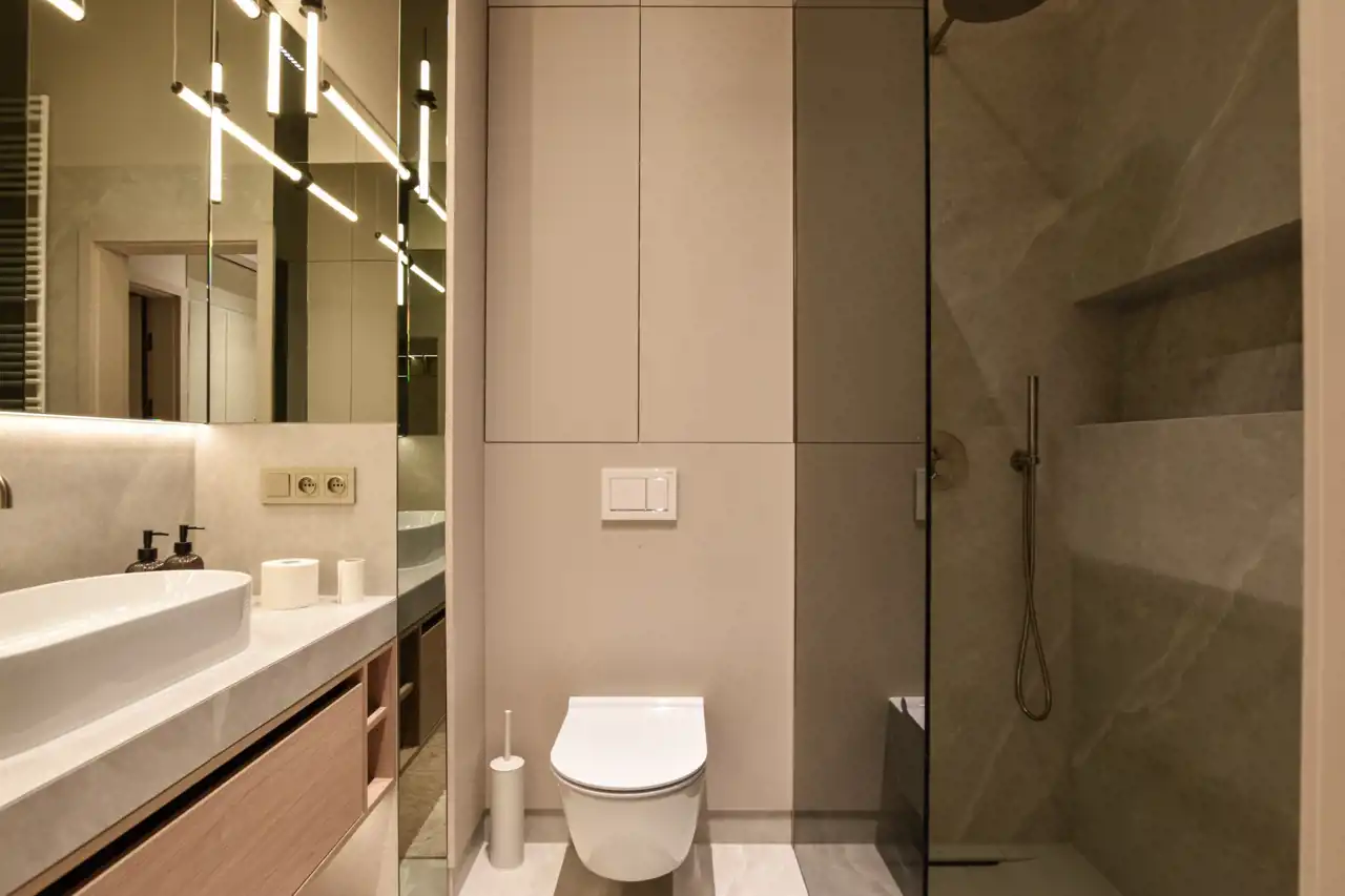 - kabina prysznicowa z podtynkowym zestawem natryskowym z deszczownicą oraz z brodzikiem bez progu, szybą walk in oraz wewnętrzna półką na kosmetyki;