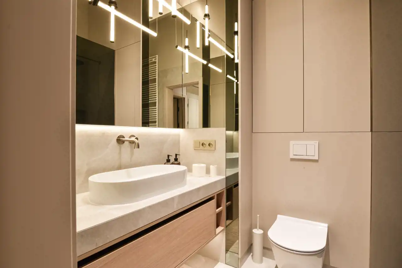 - nad miską WC szafka na detergenty i przybory łazienkowe;
