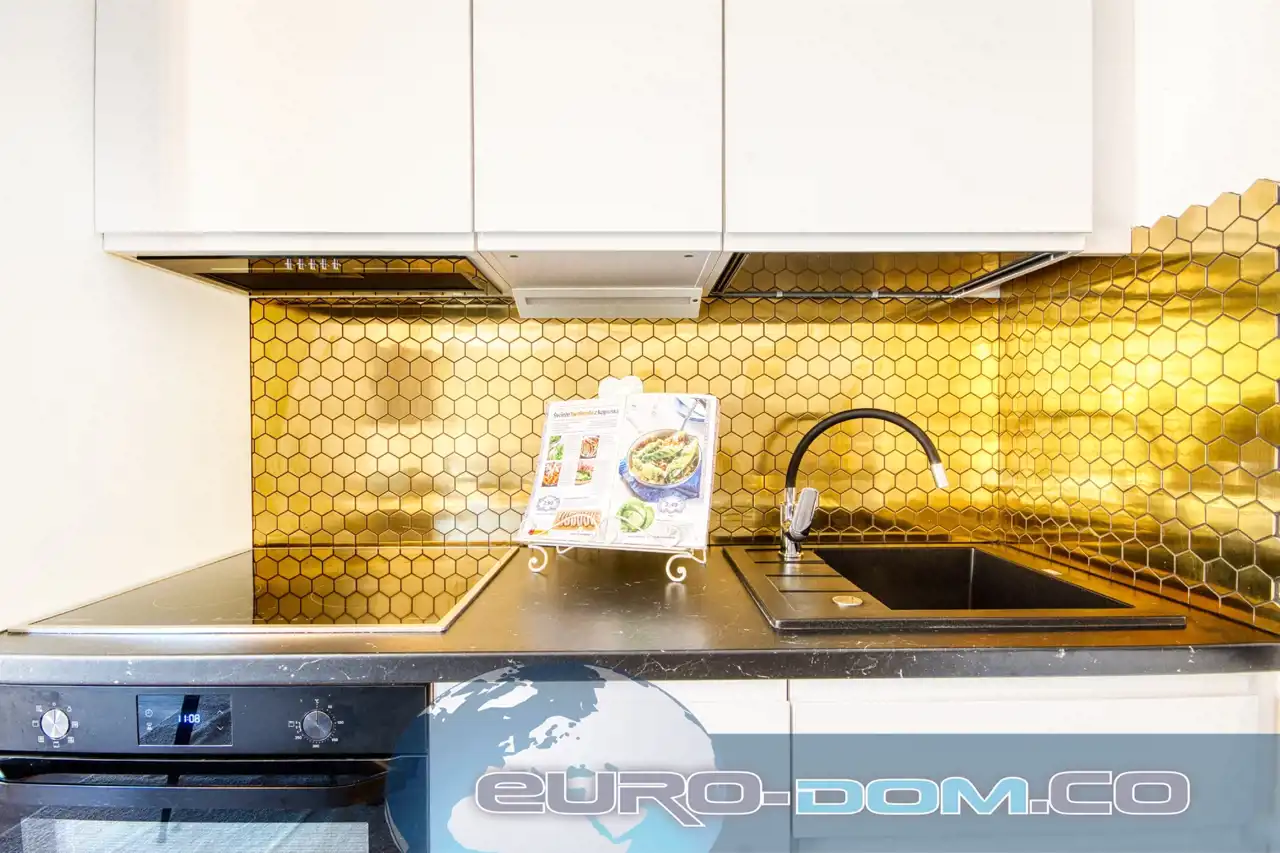 Kuchnia: lodówka z zamrażarką, zmywarka, piekarnik, płyta indukcyjna, okap, podstawowe akcesoria, mikrofala, ekspres do kawy, czajnik