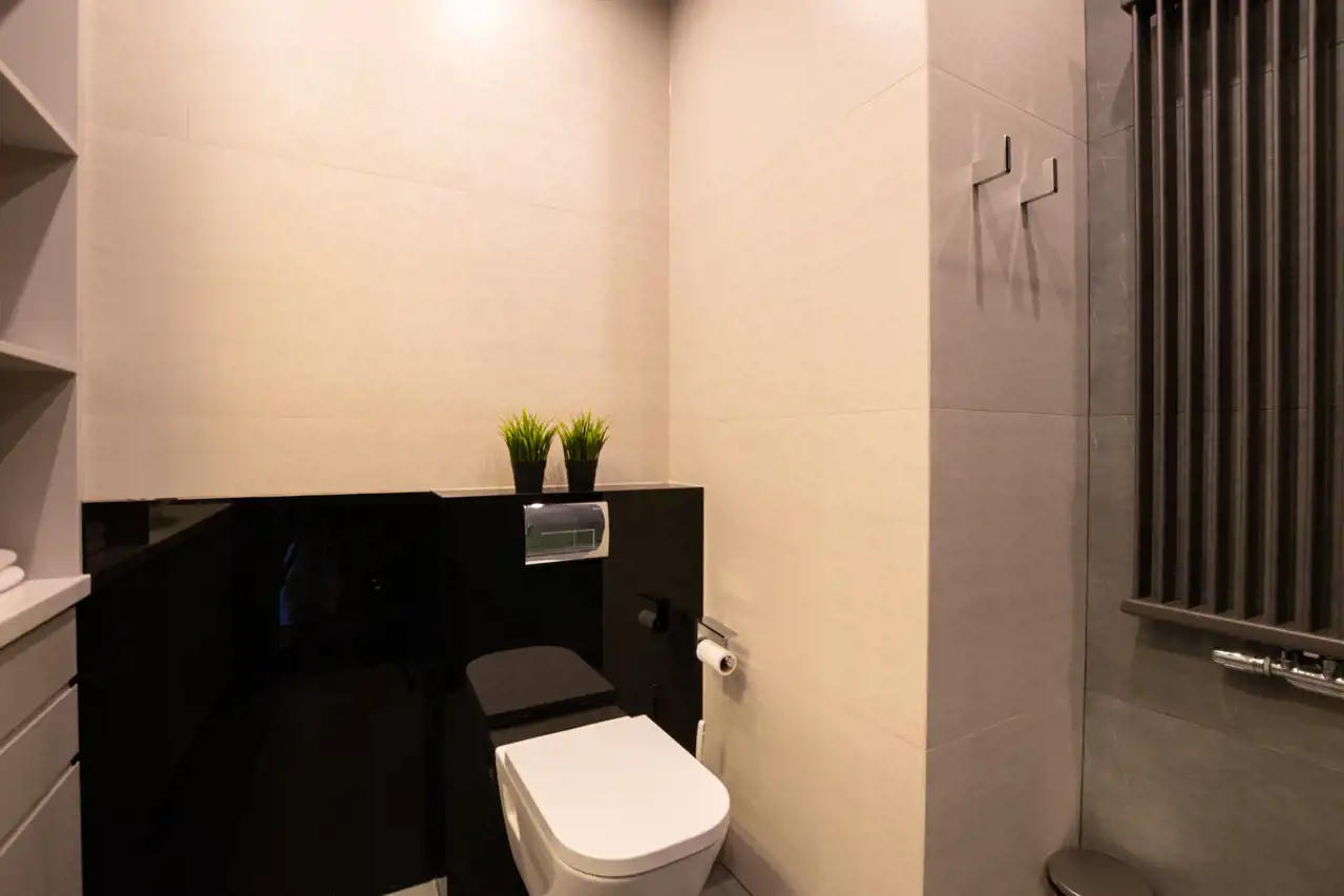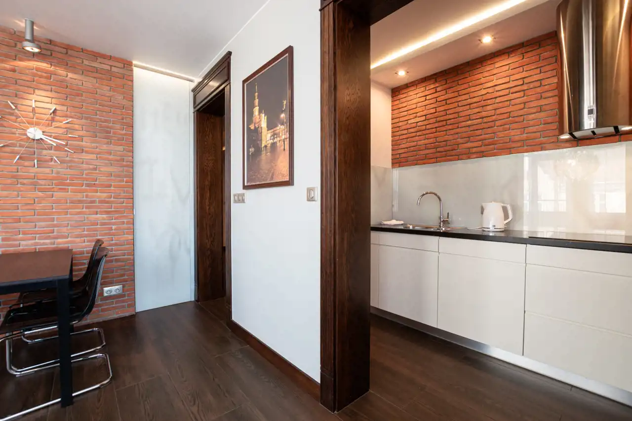 Mieszkanie w pełni umeblowane, zabudowane meblami pod wymiar. Łazienka z prysznicem i pralką. Aneks kuchenny z pełnym sprzętem AGD w zabudowie: piekarnik, mikrofala, zmywarka, lodówka, płyta indukcyjna.