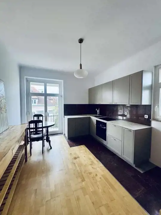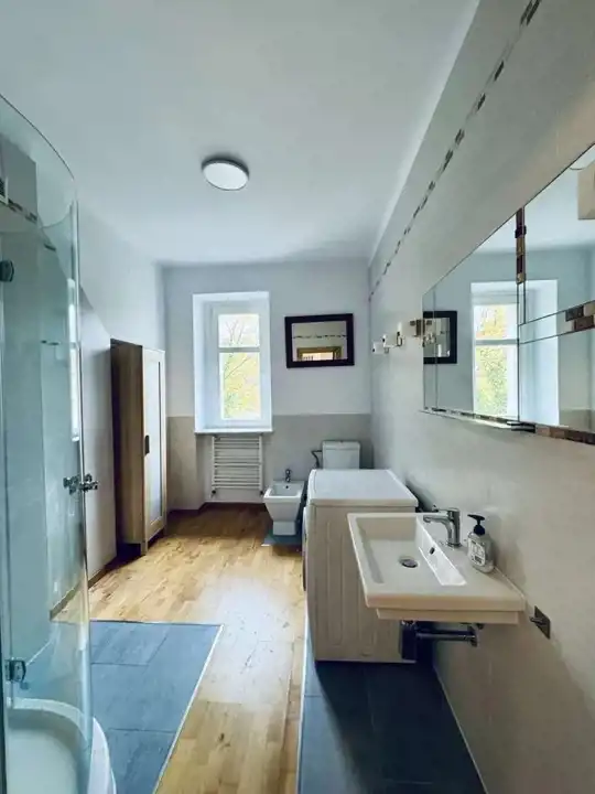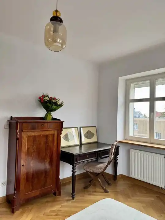 Apartament wyróżnia się przestronnym, doskonale doświetlonym wnętrzem oraz pięknie odrestaurowanymi elementami – drewnianą podłogą i drzwiami, które podkreślają jego niepowtarzalny charakter.