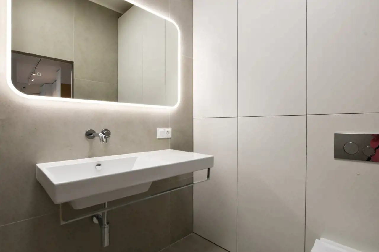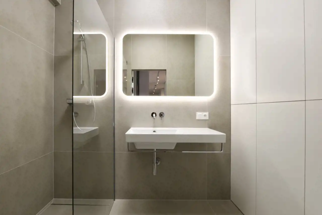 Łazienka z prysznicem, z zabudową meblową z licznym miejscem do przechowywania