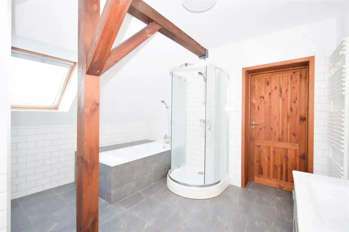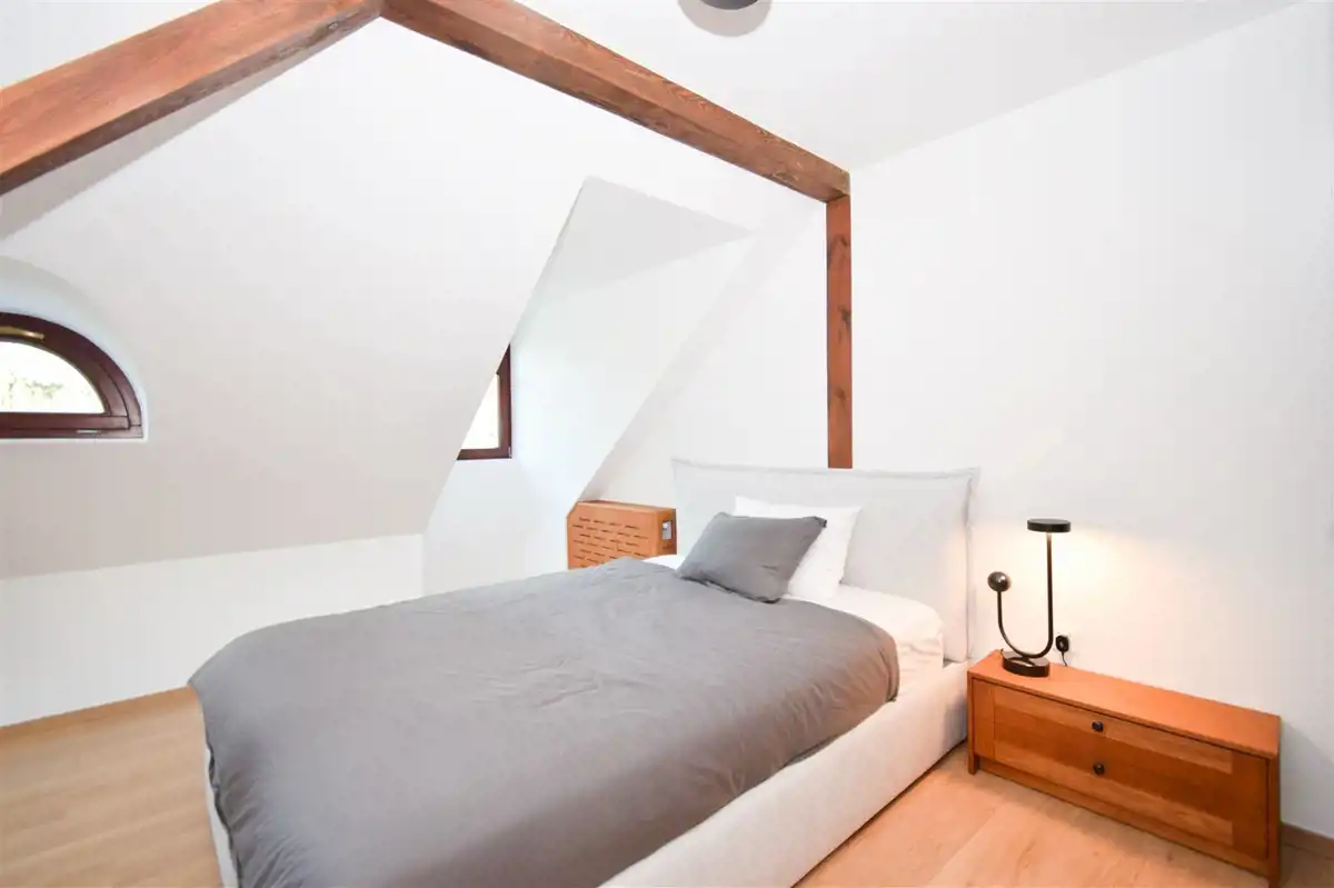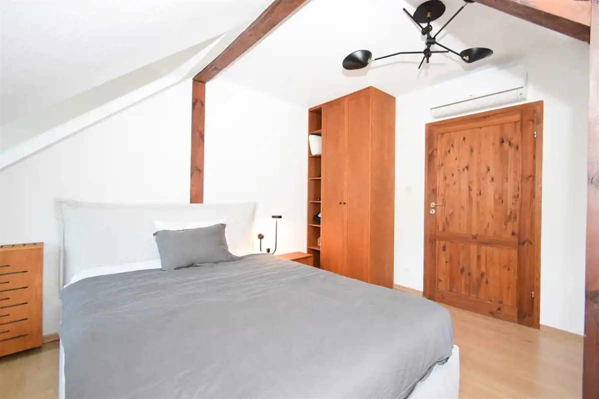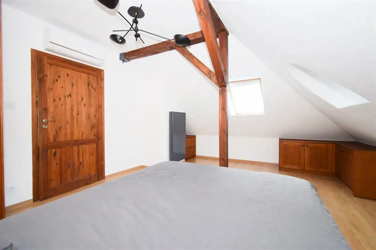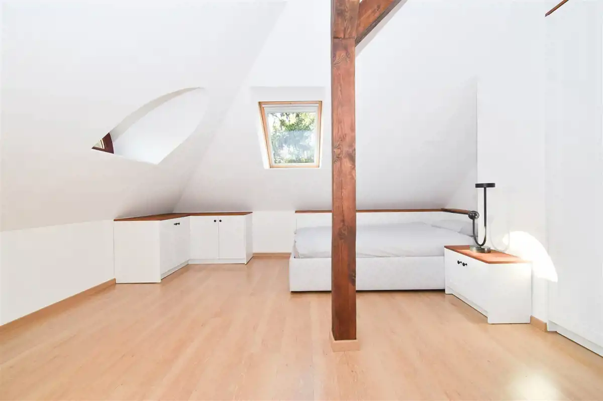 W jednej sypialni jest duże 2-osobowe łóżko, szafa w zabudowie z podświetleniem, stolik nocny, szafki pod skosami.