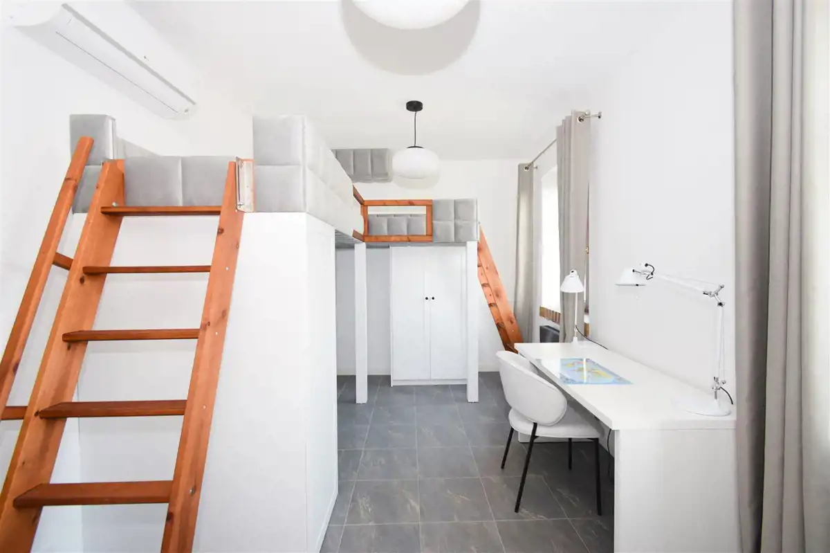 W drugiej sypialni znajduje się łóżko, szafy oraz regulowane wysokością biurko do pracy.