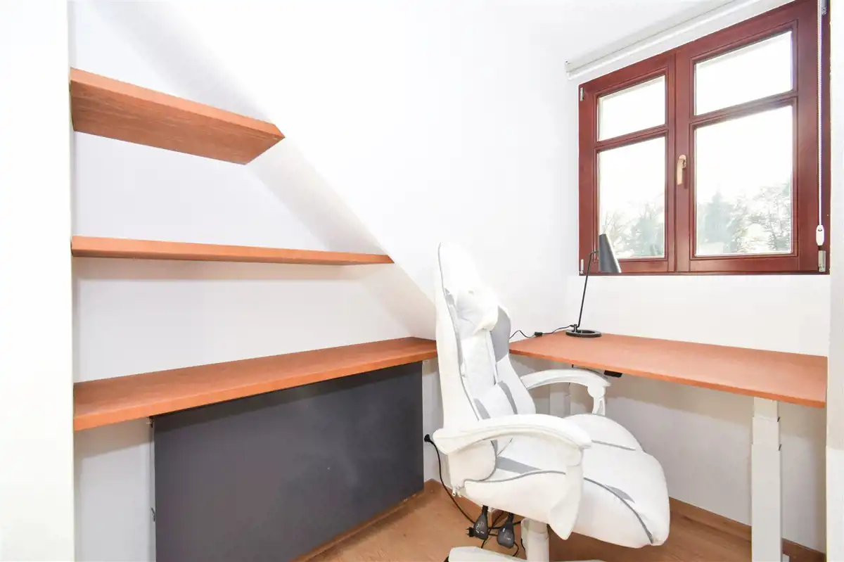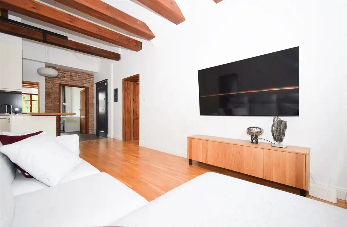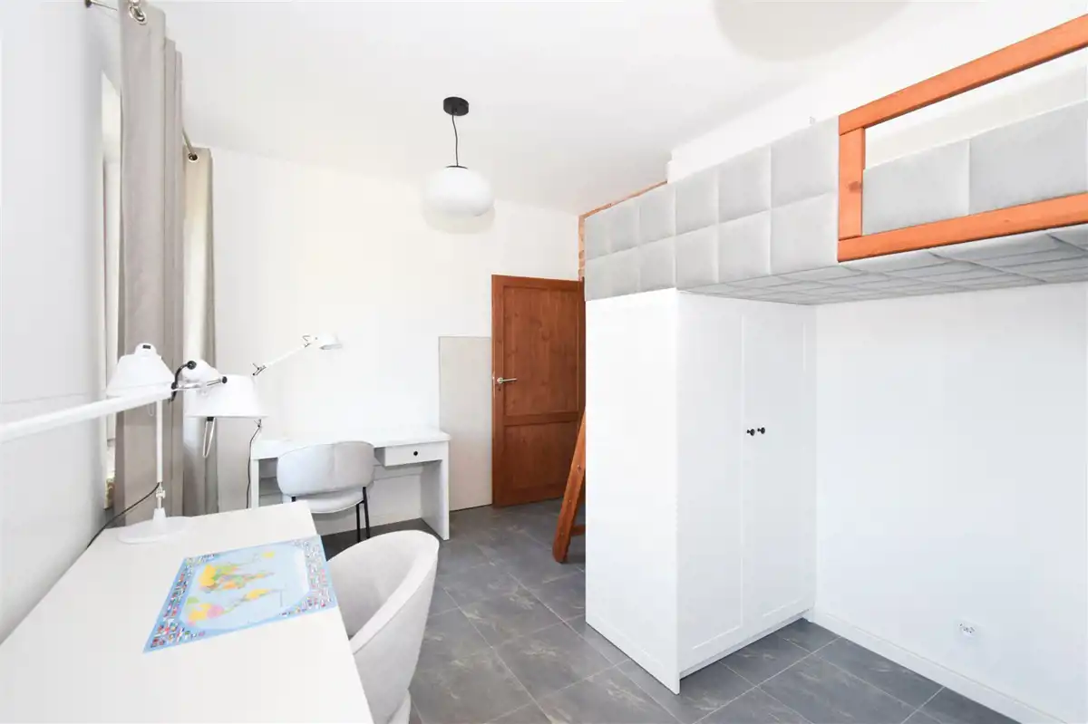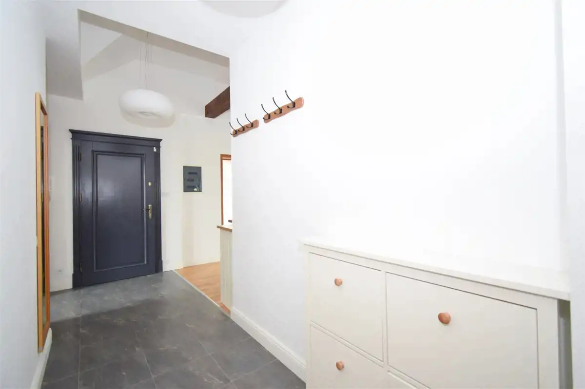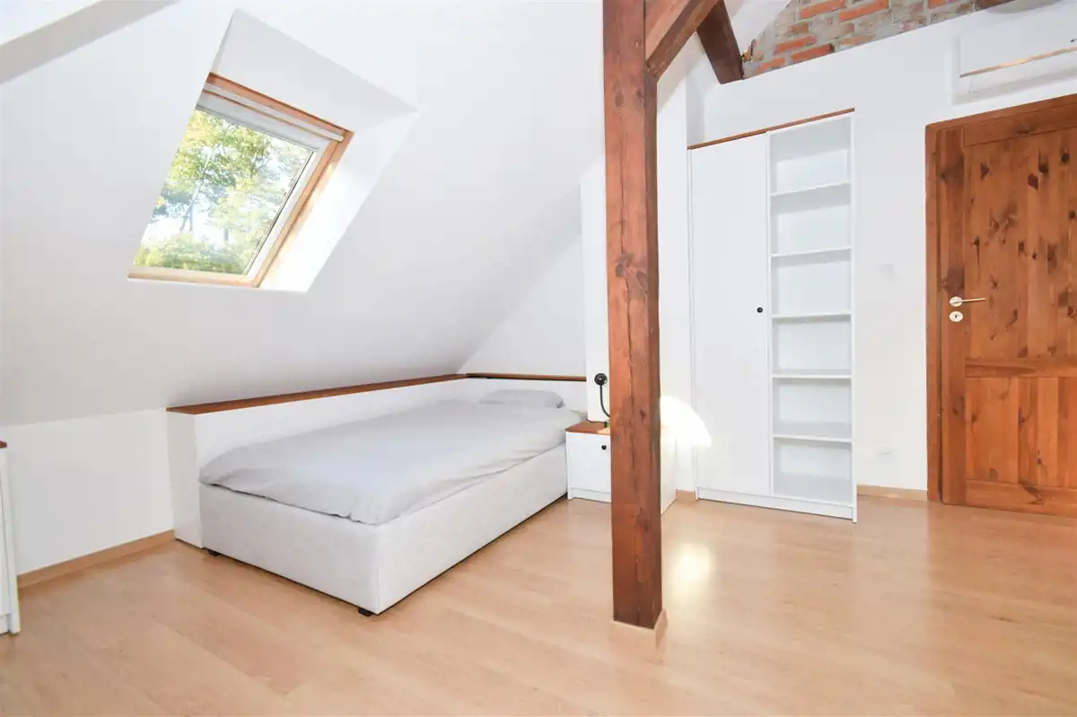 I invite you to rent the unique 4-room, air-conditioned apartment in a beautiful villa bordering the Sołacki Park in Poznan! The apartment is located in the exceptional villa with a beautiful view of the Sołacki Park. The apartment is finished to a high standard and is fully furnished. It has around 102 M2 of usable area. Its surface consists of: - a living room with a kitchenette (32 M2) - 3 bedrooms (14.17 M2; 15.87 M2 (29.83 M2 on the floor); 15.70 M2 (28.86 M2 on the floor)) - bathroom (14.61 M2) - corridor (9.94 M2) - wardrobe The plan of the apartment is attached. Apartment finishing: Built-in kitchen with household appliances (fridge-freezer, oven, dishwasher). In living room there is a big table, chairs, sofa and TV. The bathroom has a bath, shower, washing machine, sink and toilet. There is a built-in wardrobe in the corridor. In the first bedroom there is a large double bed, a built-in wardrobe with lighting, a bedside table and cabinets. The second bedroom has a bed, wardrobes and a height-adjustable work desk. The third bedroom has a bunk bed for two children, wardrobes, shelves and a desk. This room has also a hidden compartment in the wall that could be used as a walk-in closet. It measures approximately 11 squere feet of the floor space. The apartment comes with one covered parking space on the property. Other cars can be parked in front of the building - there is no paid parking zone. includes 1 parking space on the property.