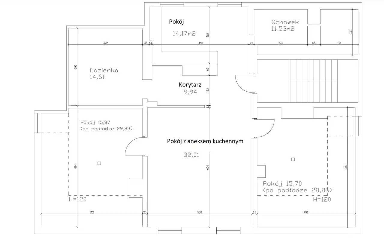- 3 pokoje sypialniane (14,17 mkw; 15,87 mkw (29,83 mkw po podłodze); 15,70 mkw (28,86 mkw po podłodze))