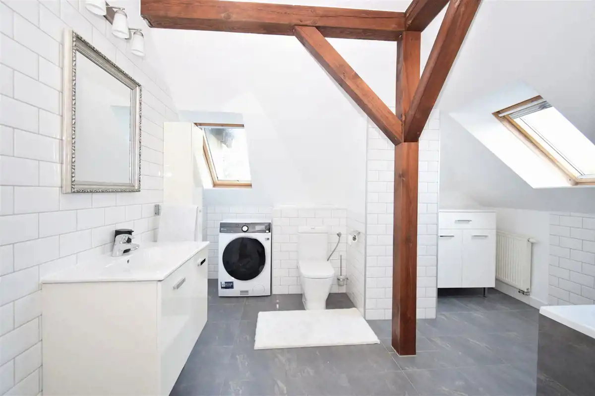 Łazienka wyposażona w wannę, prysznic, pralkę, umywalkę i wc.