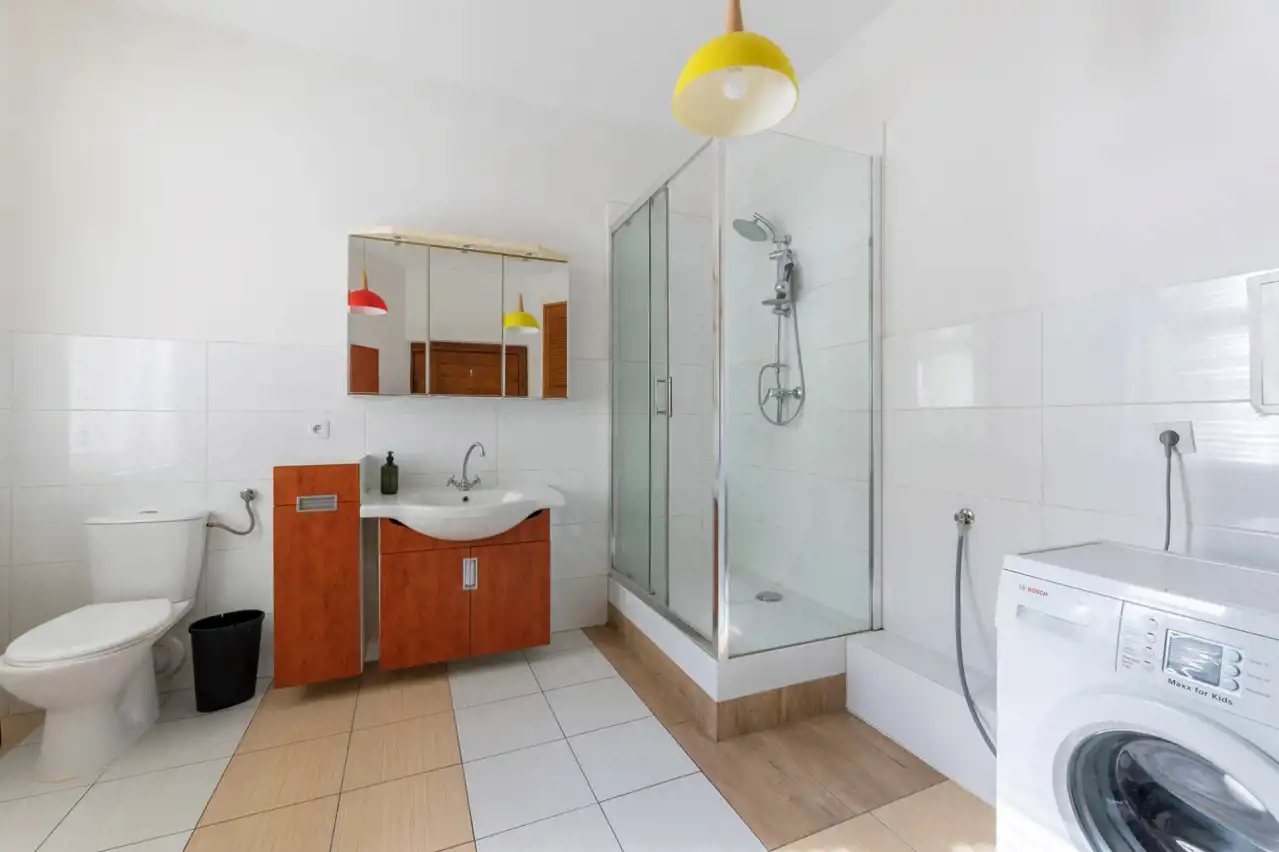 wygodne meble kuchenne z dużą ilością szafek i szuflad, AGD: duża lodówko - zamrażarka, płyta indukcyjna – 4 – palnikowa, piekarnik, pochłaniacz zapachów. W kuchni, łazience i wc na ścianach nowoczesne płytki.