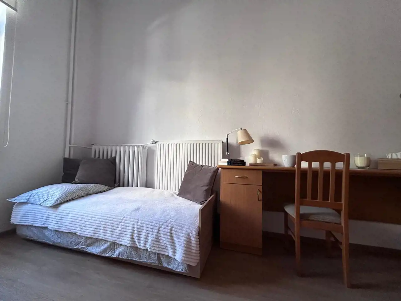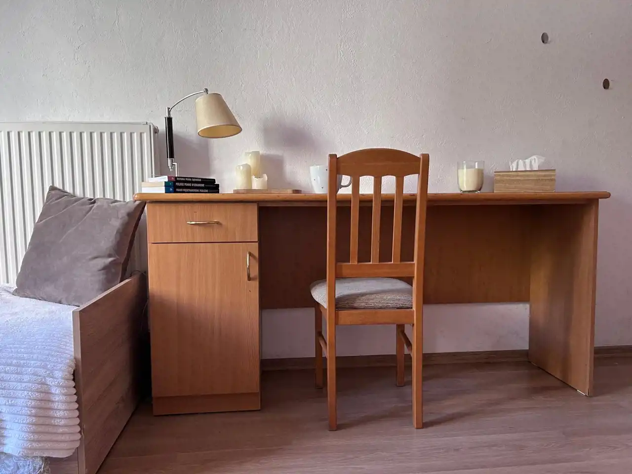 pokój: biurko z krzesłem, łóżko, szafa,