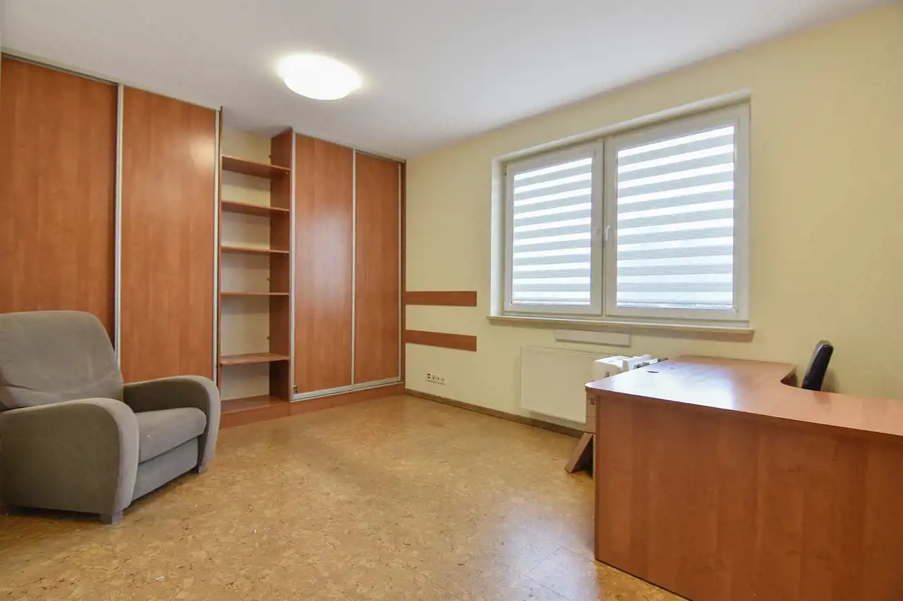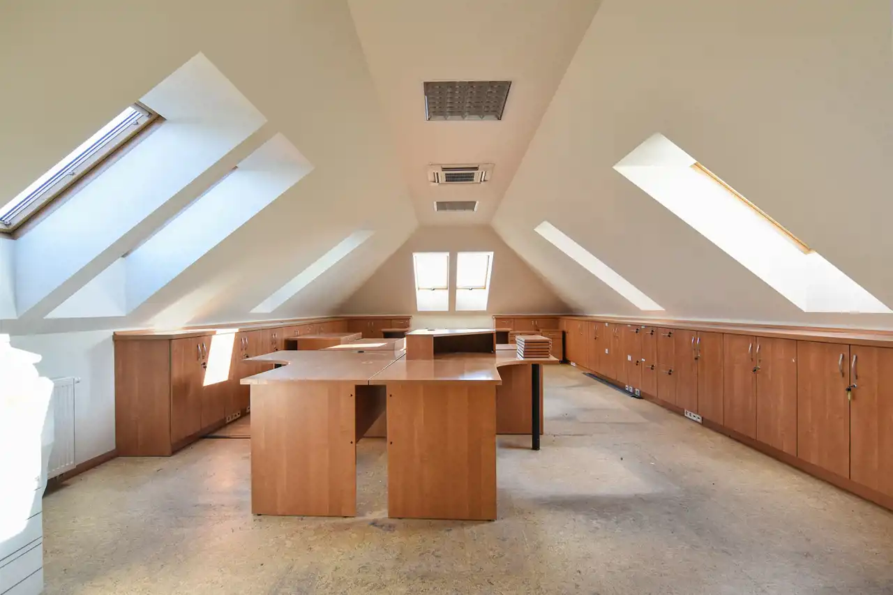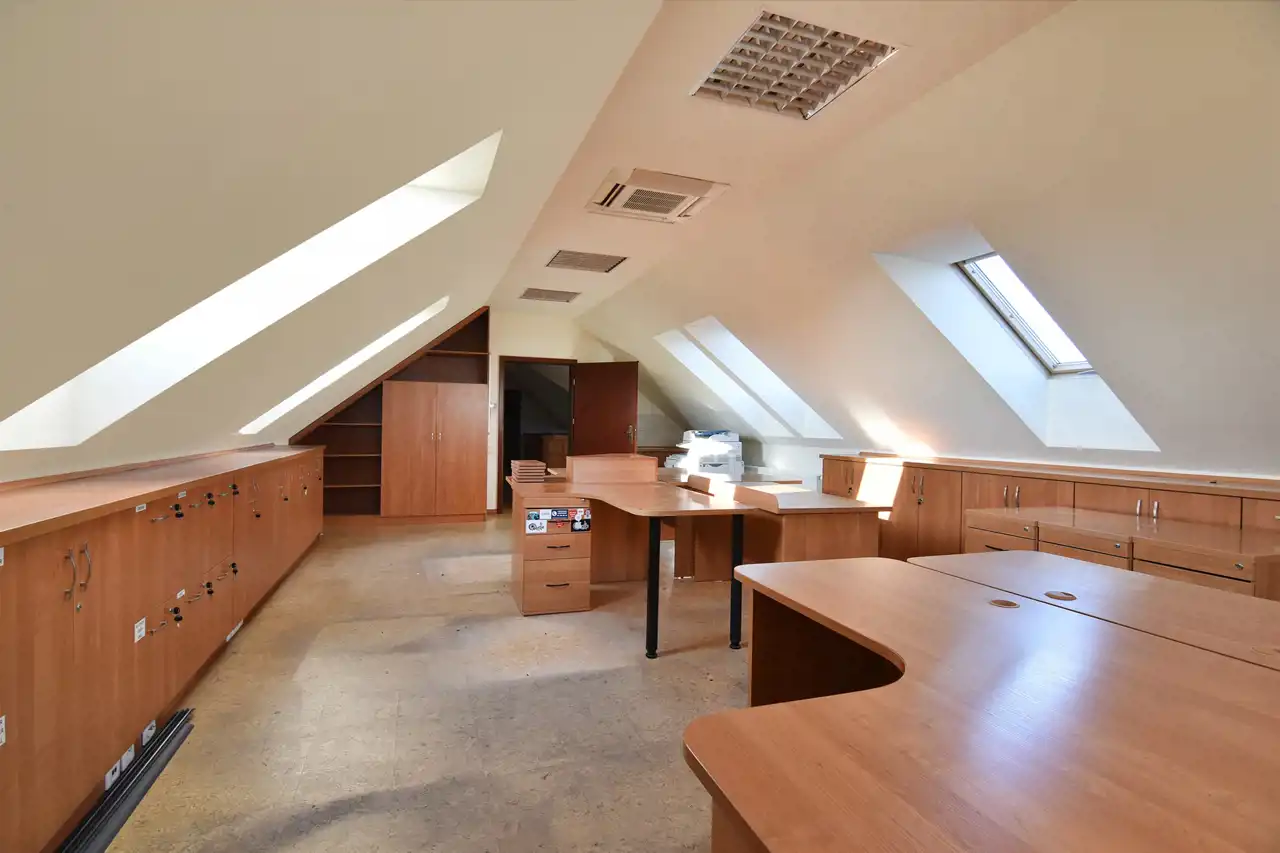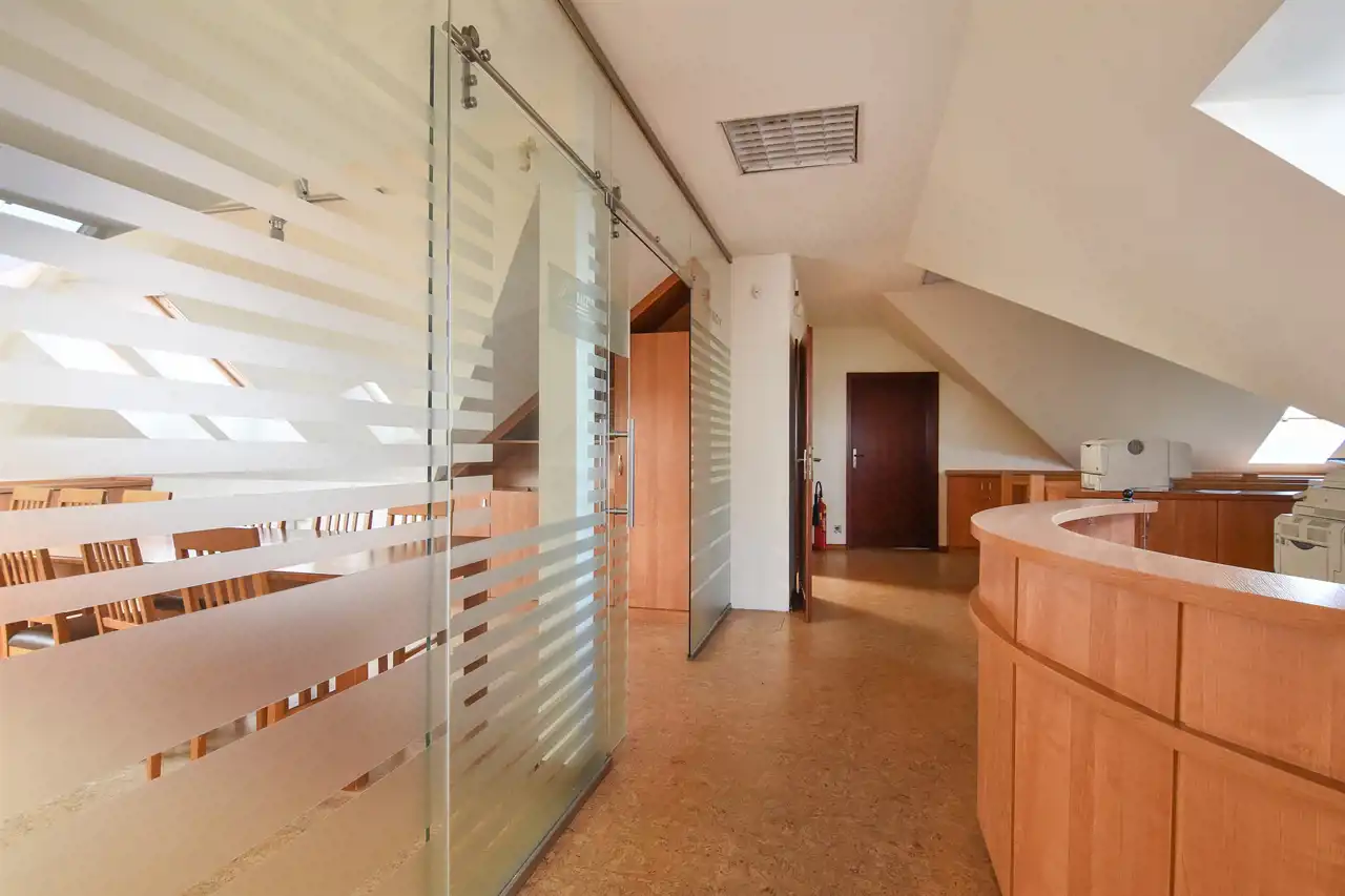 Piętro, to obecnie przestrzeń biurowa (wyposażona w biurka, szafy oraz klimatyzację), z recepcją, sporym open space-em, salką konferencyjną, dużym gabinetem, kuchnią i łazienką.
