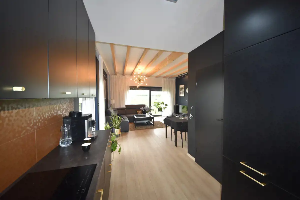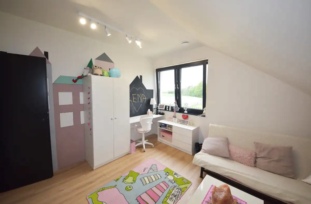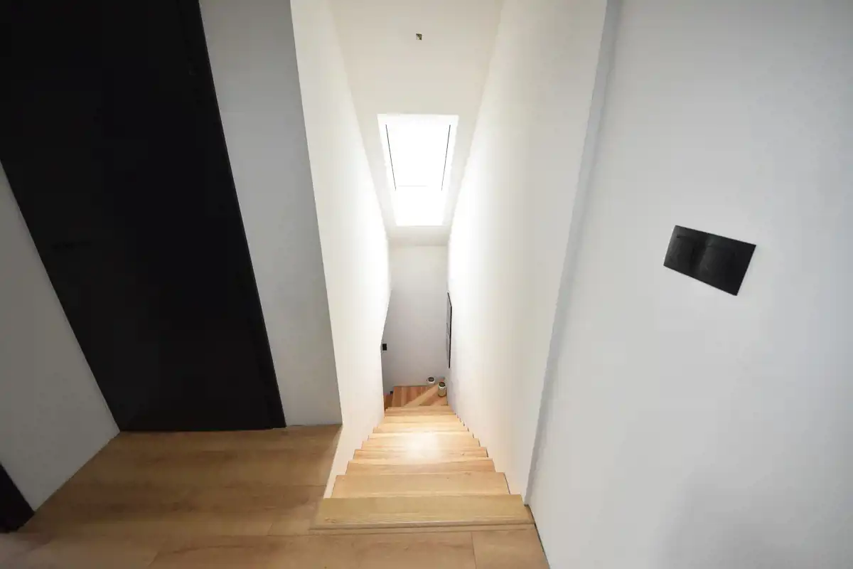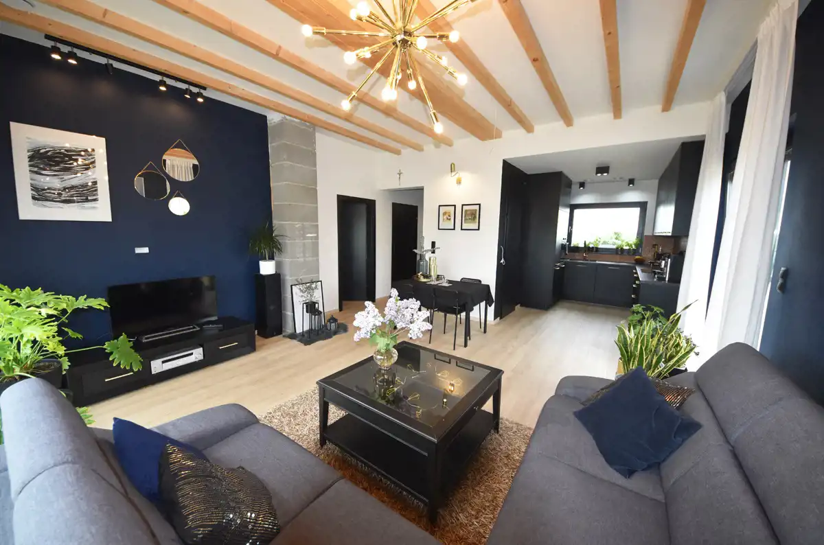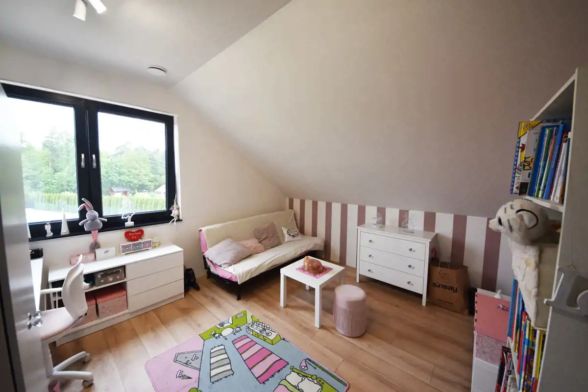 Na parterze znajduje się duży salon z kuchnią, sypialnia, łazienka z WC oraz przedpokój. Pomieszczenia o podwyższonej wysokości 3 m² dającą większą przestrzeń. Z parteru jest możliwość wyjścia i zbudowania tarasu. Na piętrze znajdują się 3 przestronne pokoje, garderoba, łazienka do wykończenia. Łazienka na dole wyposażona w WC i bidet, wykafelkowana, wyposażona w kabinę prysznicową z odpływem liniowym, 2 umywalki i 2 lustra oraz meble łazienkowe. Łazienka na górze do wykończenia (łazienka ma wyprowadzone podłączenia pod WC, umywalkę, wannę oraz odpływ liniowy pod prysznic). Kuchnia: podłoga panele, wyposażona w kuchenkę elektryczną, płytę indukcyjną, zmywarkę, lodówko-zamrażalkę, zlewozmywak z baterią, meble kuchenne wiszące i stojące w nowoczesnym stylu. W pokojach na podłogach panele quick step o podwyższonej ścieralności, ściany gładzie, sufity otynkowane.