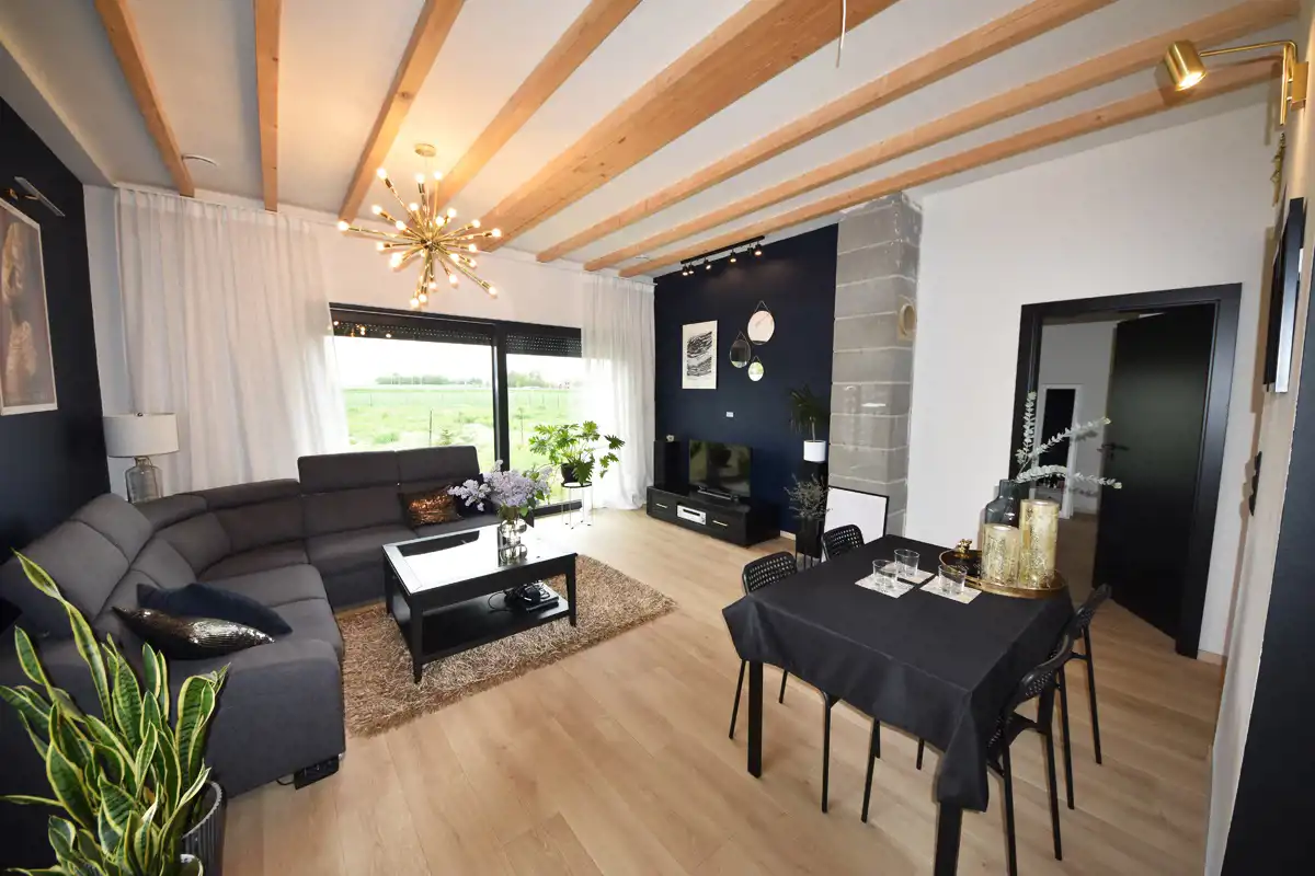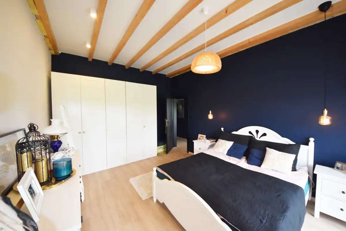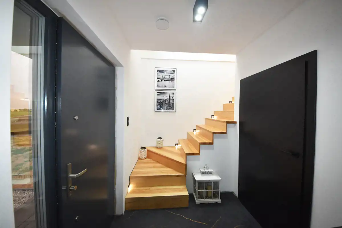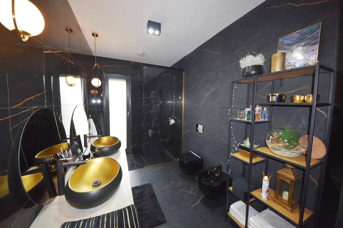 Na parterze znajduje się duży salon z kuchnią, sypialnia, łazienka z WC oraz przedpokój. Pomieszczenia o podwyższonej wysokości 3 m² dającą większą przestrzeń. Z parteru jest możliwość wyjścia i zbudowania tarasu. Na piętrze znajdują się 3 przestronne pokoje, garderoba, łazienka do wykończenia. Łazienka na dole wyposażona w WC i bidet, wykafelkowana, wyposażona w kabinę prysznicową z odpływem liniowym, 2 umywalki i 2 lustra oraz meble łazienkowe. Łazienka na górze do wykończenia (łazienka ma wyprowadzone podłączenia pod WC, umywalkę, wannę oraz odpływ liniowy pod prysznic). Kuchnia: podłoga panele, wyposażona w kuchenkę elektryczną, płytę indukcyjną, zmywarkę, lodówko-zamrażalkę, zlewozmywak z baterią, meble kuchenne wiszące i stojące w nowoczesnym stylu. W pokojach na podłogach panele quick step o podwyższonej ścieralności, ściany gładzie, sufity otynkowane.