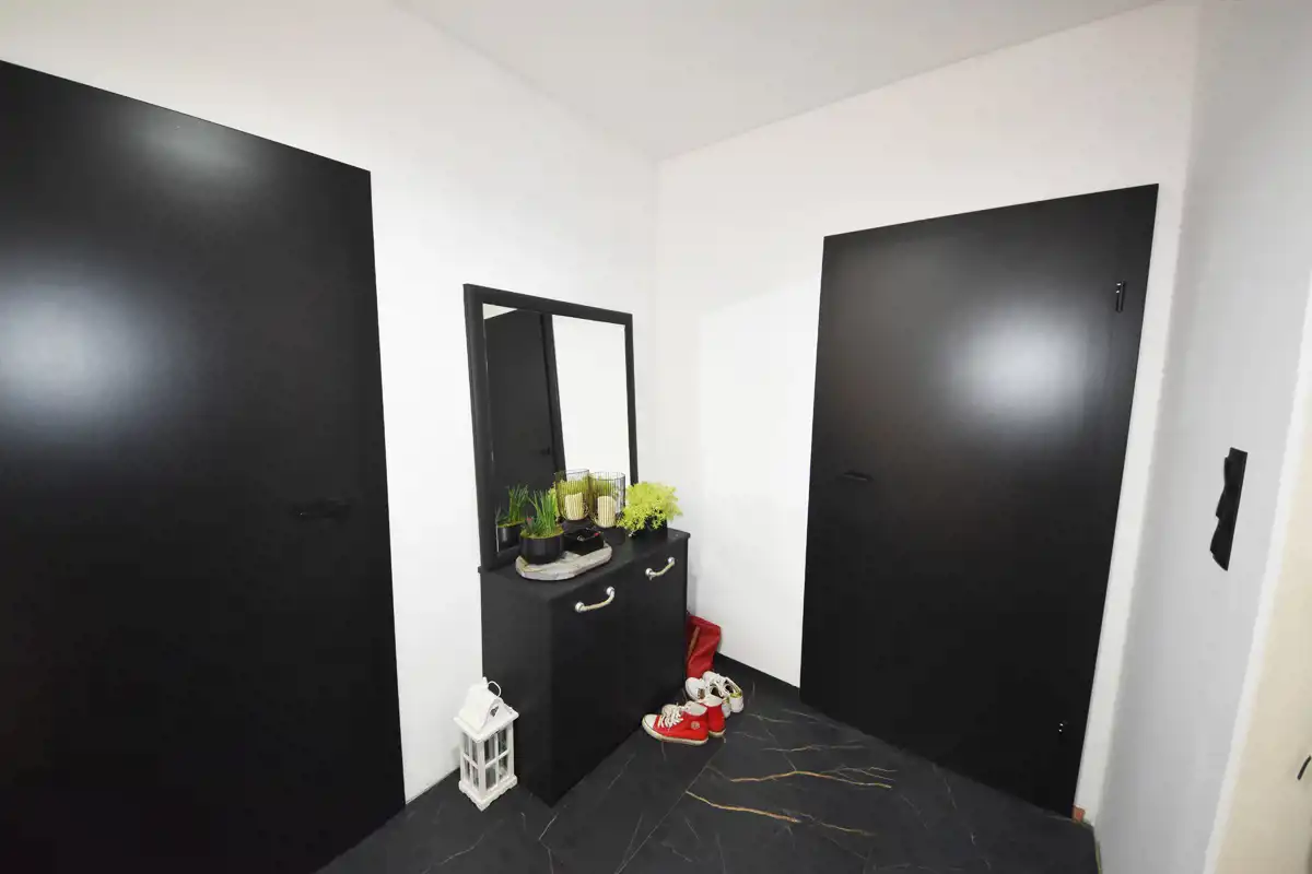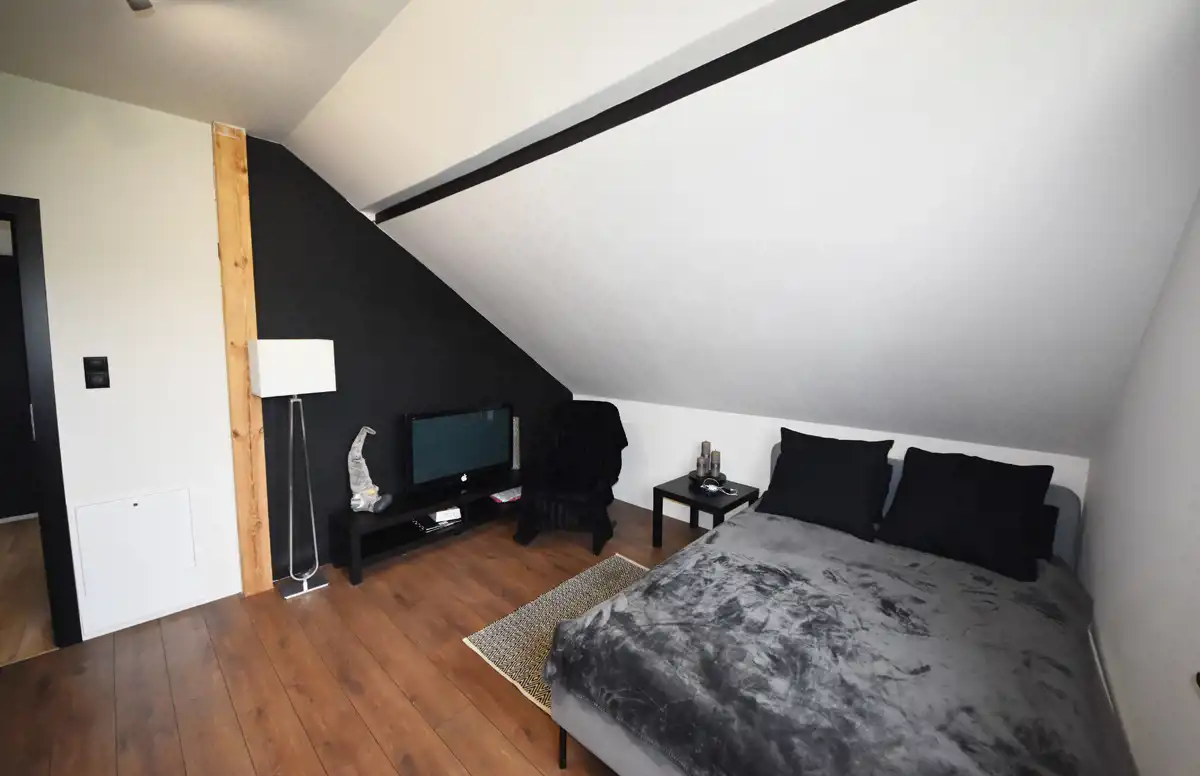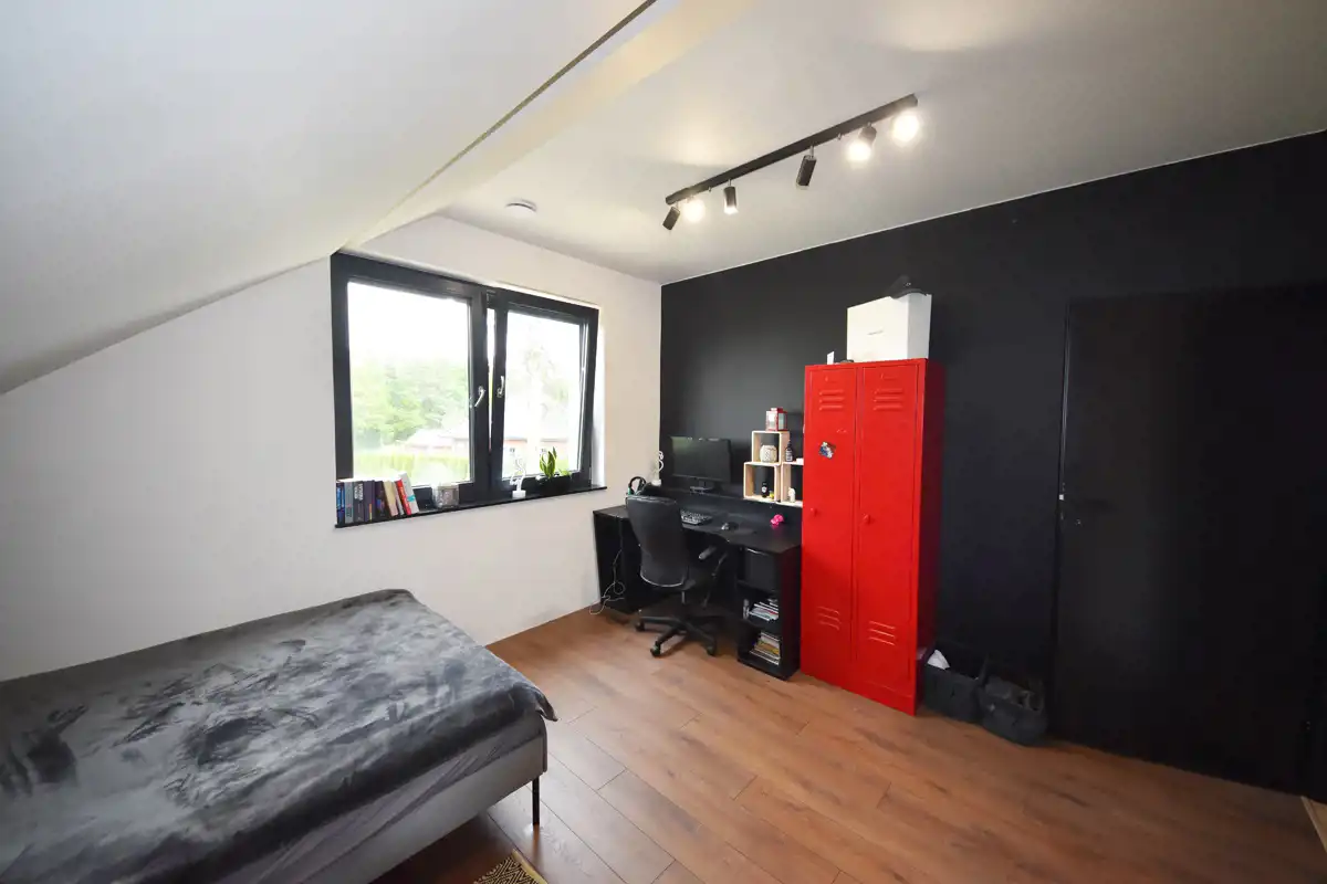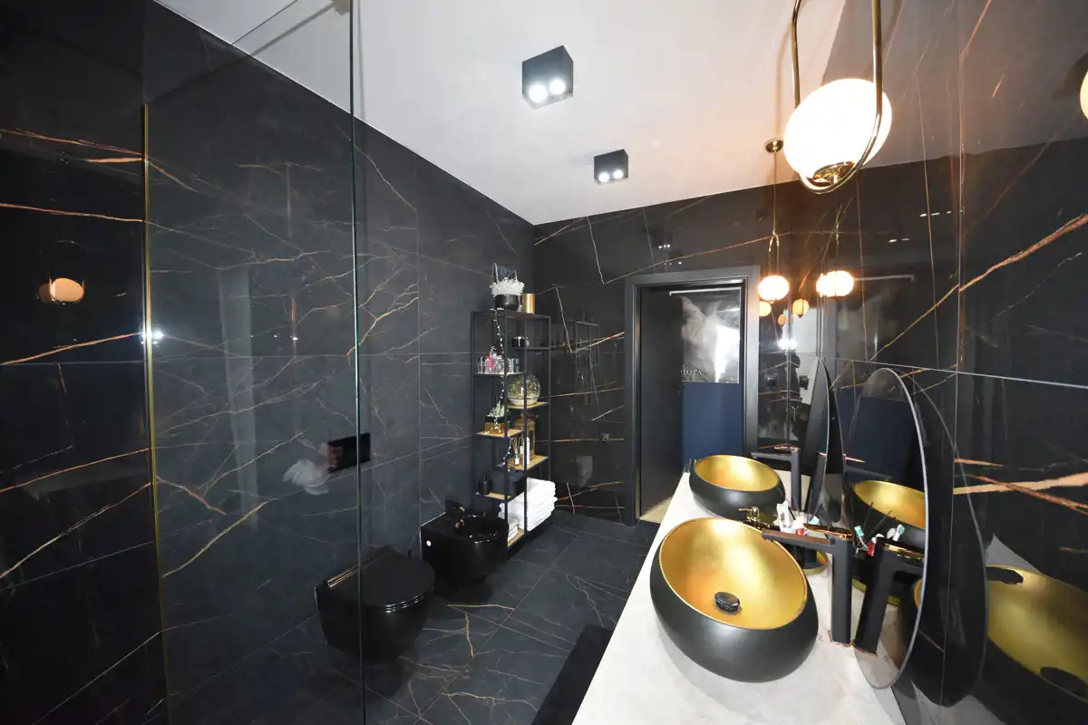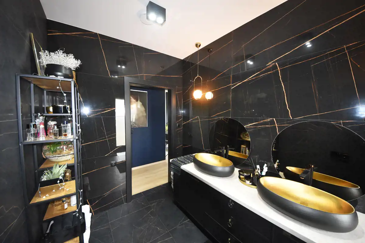 Na parterze znajduje się duży salon z kuchnią, sypialnia, łazienka z WC oraz przedpokój. Pomieszczenia o podwyższonej wysokości 3 m² dającą większą przestrzeń. Z parteru jest możliwość wyjścia i zbudowania tarasu. Na piętrze znajdują się 3 przestronne pokoje, garderoba, łazienka do wykończenia. Łazienka na dole wyposażona w WC i bidet, wykafelkowana, wyposażona w kabinę prysznicową z odpływem liniowym, 2 umywalki i 2 lustra oraz meble łazienkowe. Łazienka na górze do wykończenia (łazienka ma wyprowadzone podłączenia pod WC, umywalkę, wannę oraz odpływ liniowy pod prysznic). Kuchnia: podłoga panele, wyposażona w kuchenkę elektryczną, płytę indukcyjną, zmywarkę, lodówko-zamrażalkę, zlewozmywak z baterią, meble kuchenne wiszące i stojące w nowoczesnym stylu. W pokojach na podłogach panele quick step o podwyższonej ścieralności, ściany gładzie, sufity otynkowane.