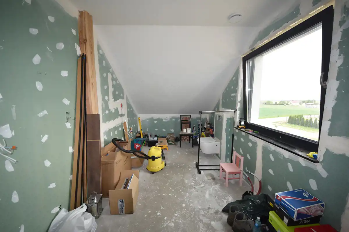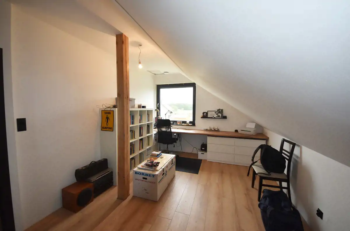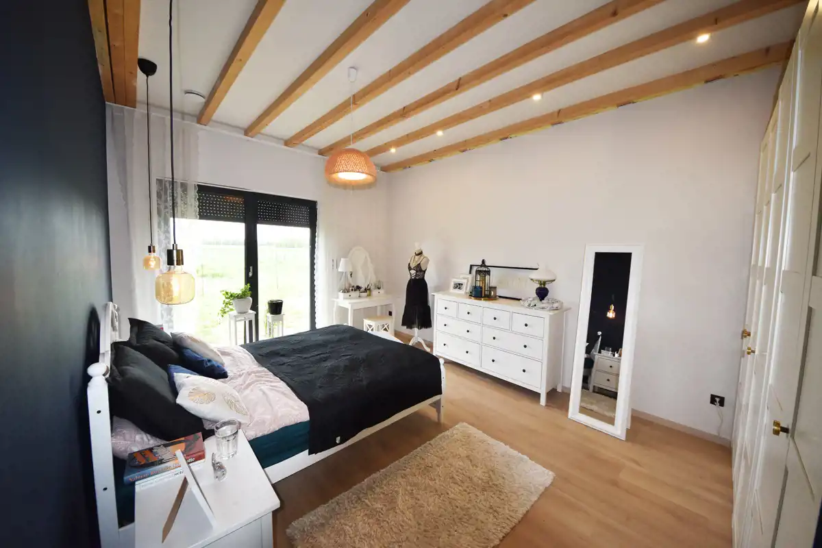 KONSTRUKCJA DOMU: drewniana szkieletowa o podstawie 10 x 10 cm² (kwadrat). Ściany warstwowe z elementów drewnianych - karton gips + 25 cm wełny w rolkach + folia + styropian grafitowy 20 cm. Strop pomiędzy parterem a poddaszem betonowy. Typ dachu: konstrukcja drewniana, pokryty dachówką ceramiczną. Stolarka okienna PCV 3 szybowa oraz nowa stolarka drzwiowa.