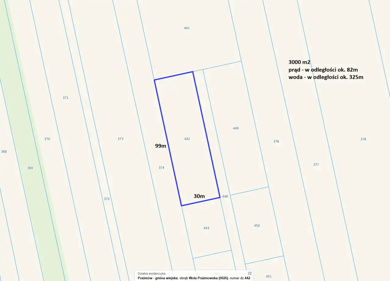 - Media Woda: w ulicy; Kanalizacja: brak; Prąd: w ulicy; Gaz: brak