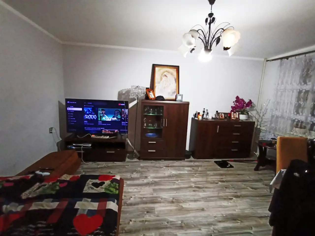 Dom do wykończenia, na podłogach pomieszczeń wykładzina PCV i panele, ściany częściowo szpachlowane i malowane, w łazienkach i kuchni glazura.