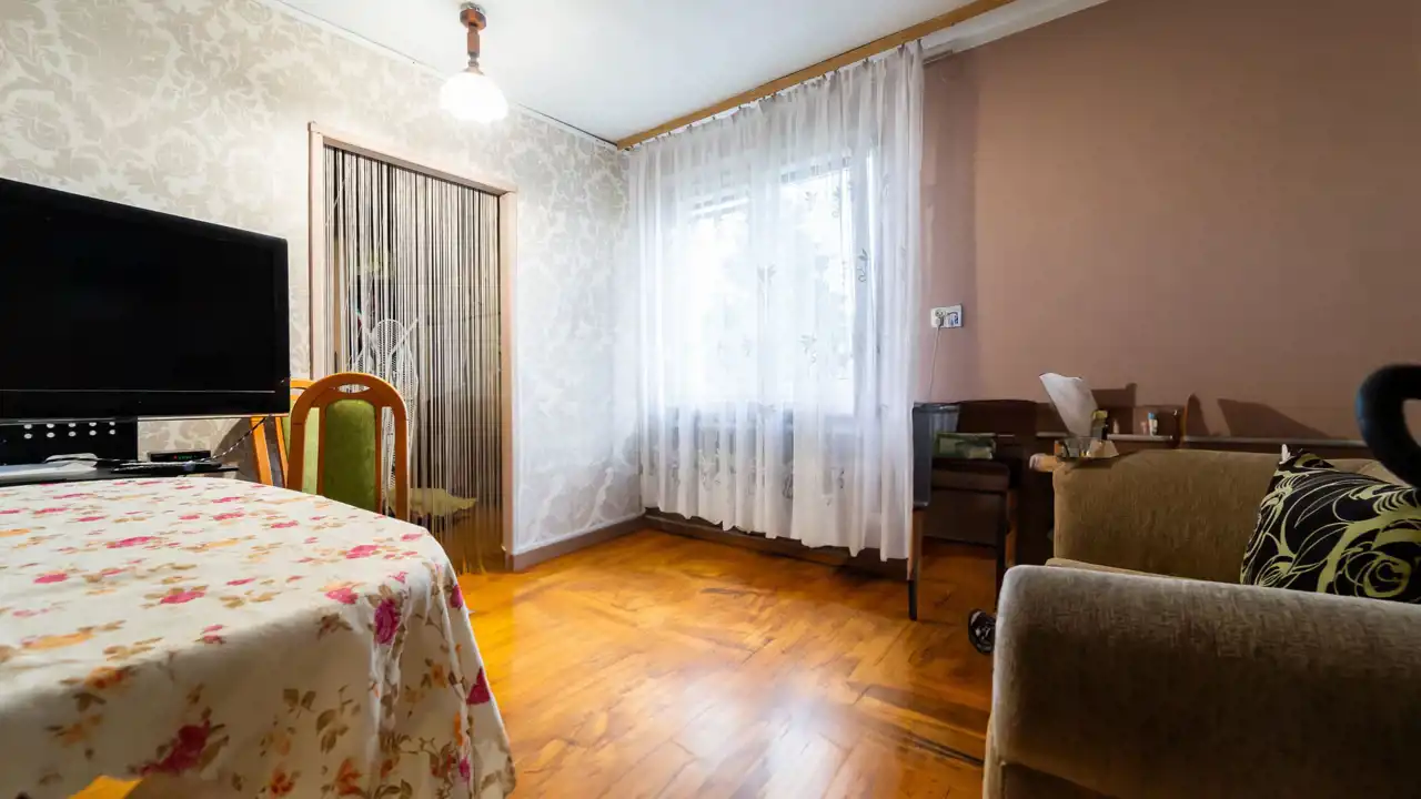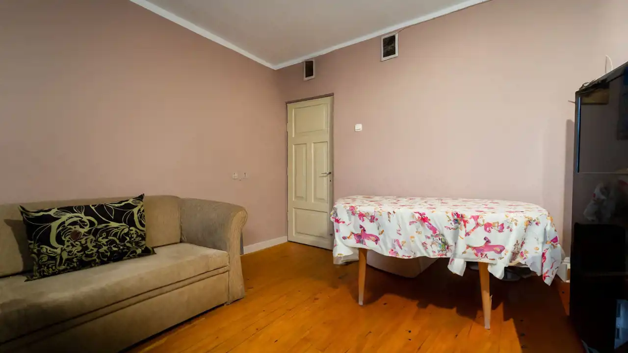 - Podłogi: wykładzina podłogowa na wylewce betonowej (przedpokój, kuchnia, dwa pokoje), parkiet drewniany (jeden z pokoi), płytki podłogowe (łazienka), wylewka betonowa częściowo wyłożona płytkami (pomieszczenie gospodarcze).