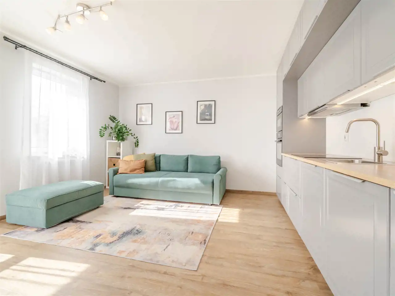 słoneczny salon z aneksem kuchennym i wyjściem na balkon,