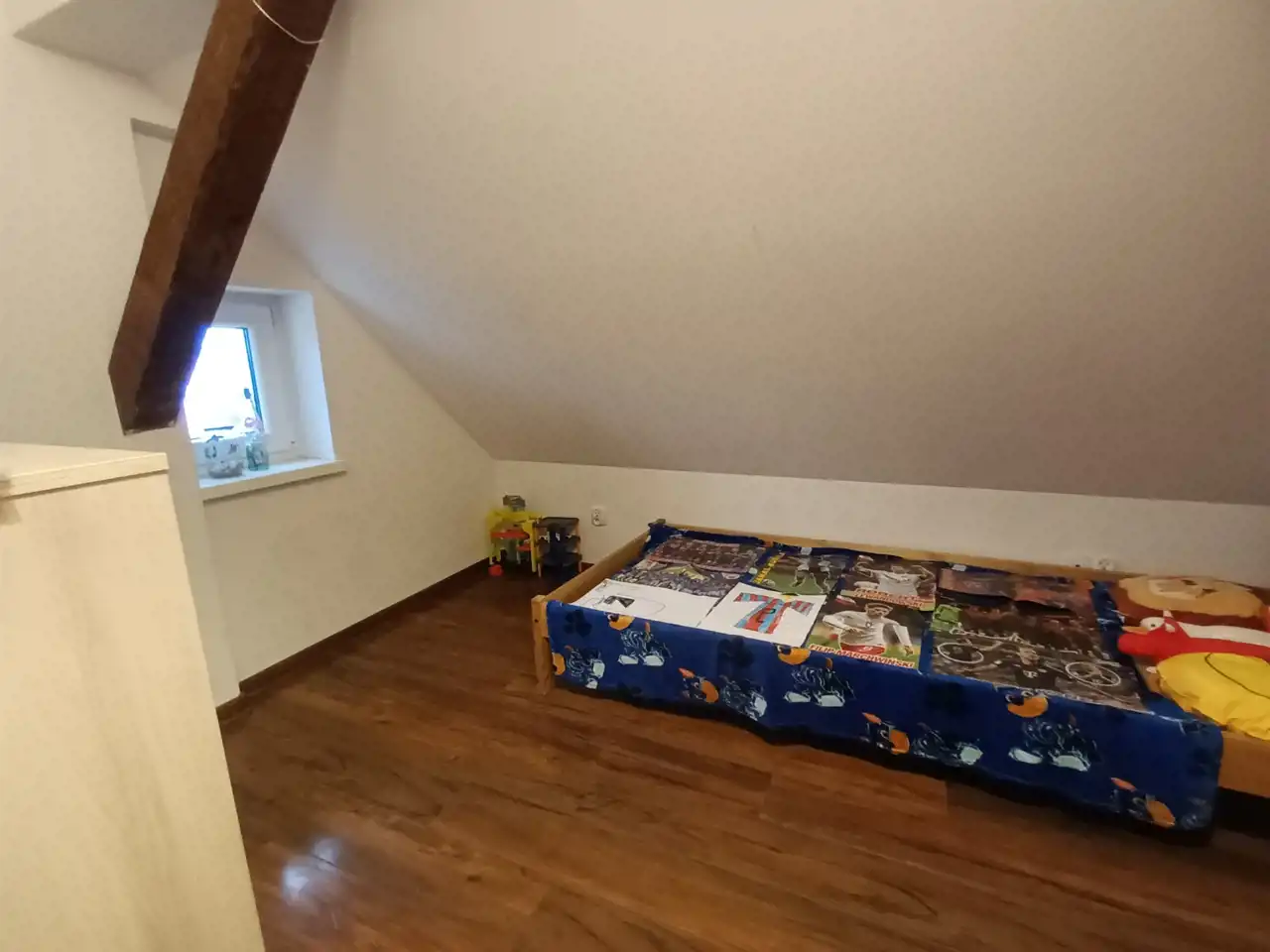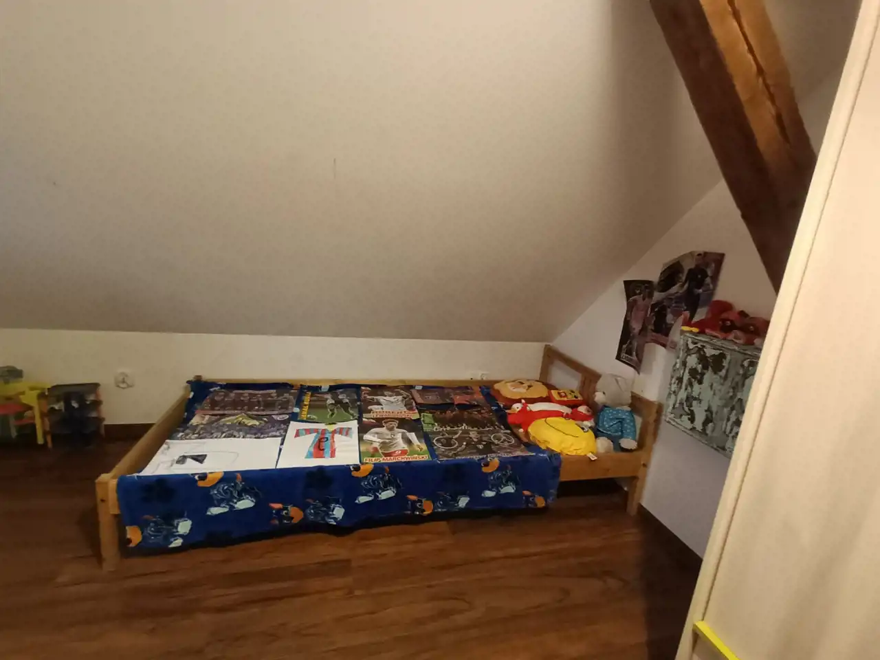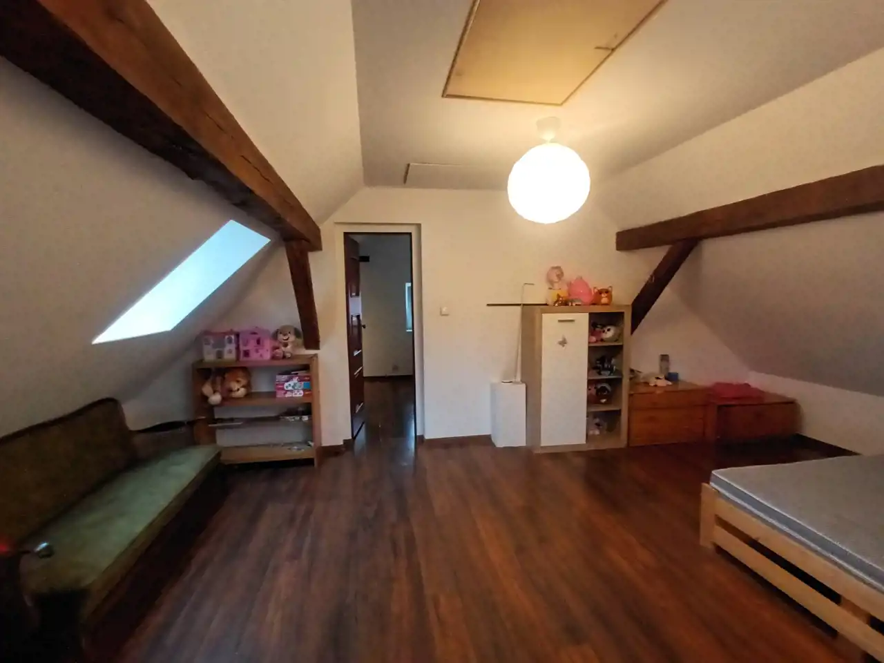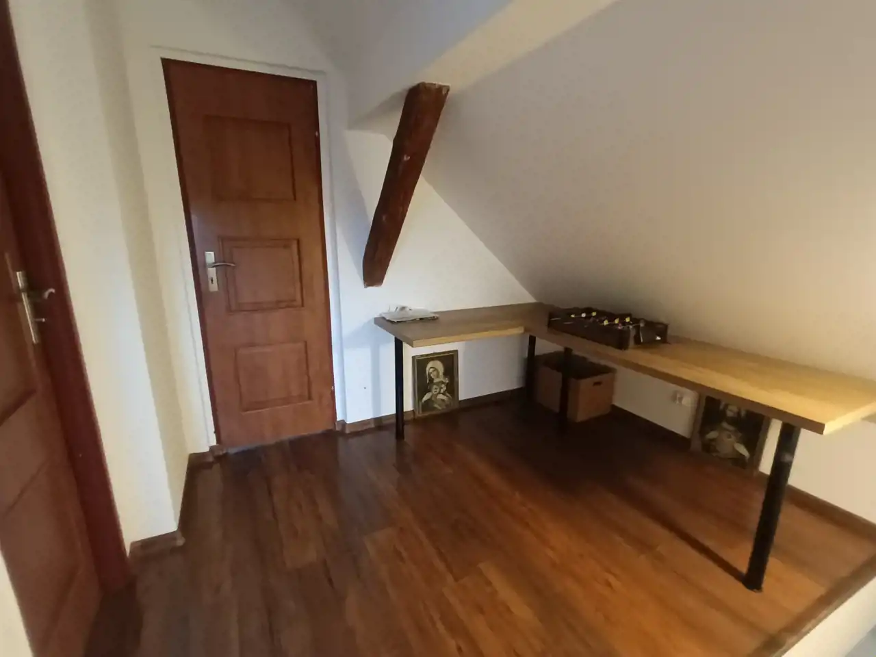 Sprzedam dwupoziomowe mieszkanie o pow. ok 80 m.kw. z dużą działką o pow. 1100 m.kw., które stanowi połowę domu. Usytuowane jest ono na na piętrze i poddaszu, posiada oddzielne wejście, dwa tarasy. Pierwszy poziom o pow. 49 m.kw składa się z dużego salonu z aneksem kuchennym i jadalnią, jednej sypialni, łazienki i korytarza. Na drugim poziomie o tej samej powierzchni po podłodze (ok. 30 m.kw pow. użytkowej) znajdują się dwie sypialnie i korytarz. Mieszkanie na księdze wieczystej ma powierzchnię 51,5 m.kw.