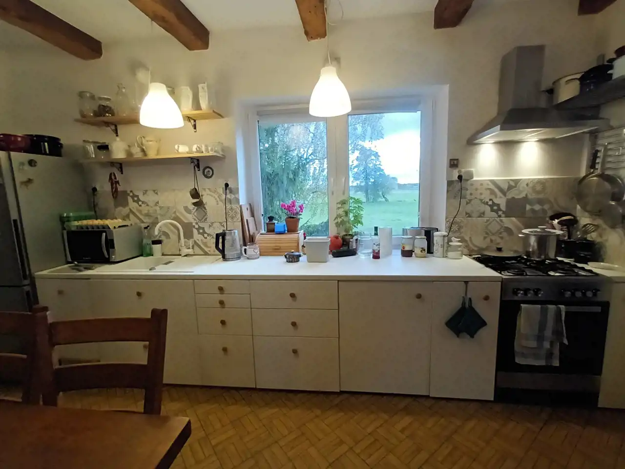 Na podłogach deska i kafle. Okna PCV. Ogrzewanie- kominek z rozprowadzeniem oraz grzejnik elektryczny. Podgrzewanie wody- bojler elektryczny przepływowy 30kW. Wyposażenie mieszkania do uzgodnienia.