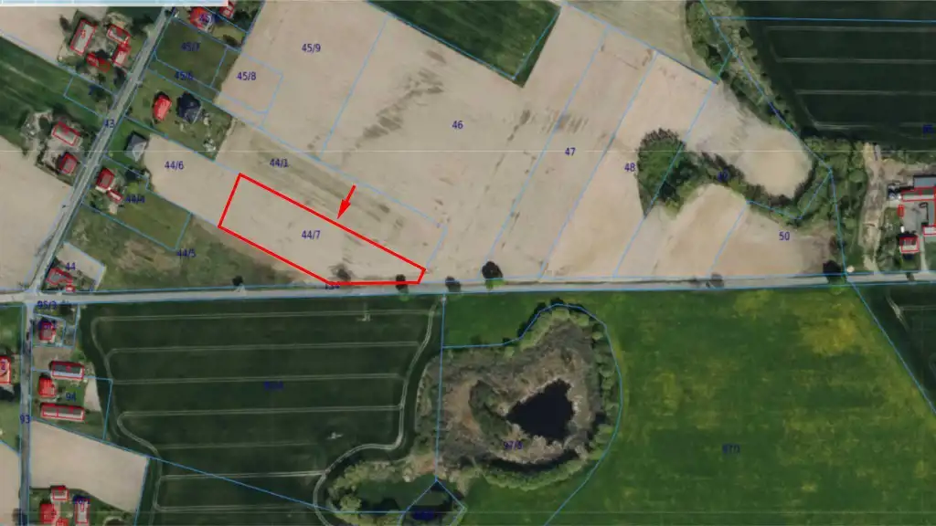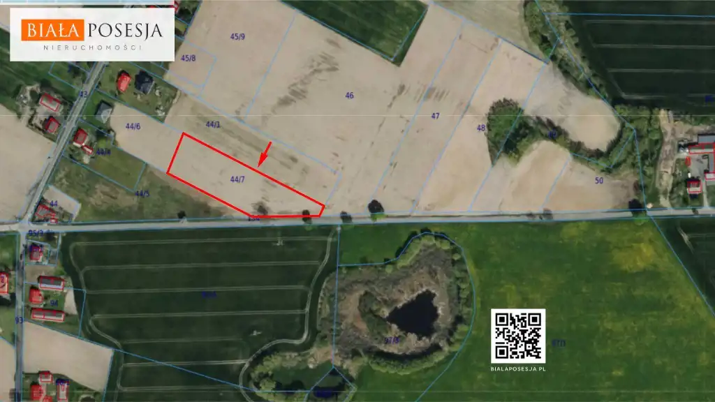 Działka nr 44/7 o powierzchni 0,6108 ha, niezagospodarowana, teren płaski, rolno-budowlany, w trakcie realizacji warunków zabudowy. Istnieje możliwość podziału na mniejsze działki. Nieruchomość posiada bezpośredni dostęp do drogi gminnej asfaltowej. W sąsiedztwie występuje luźna zabudowa jednorodzinna oraz tereny rolne, łąki, lasy i jeziora.