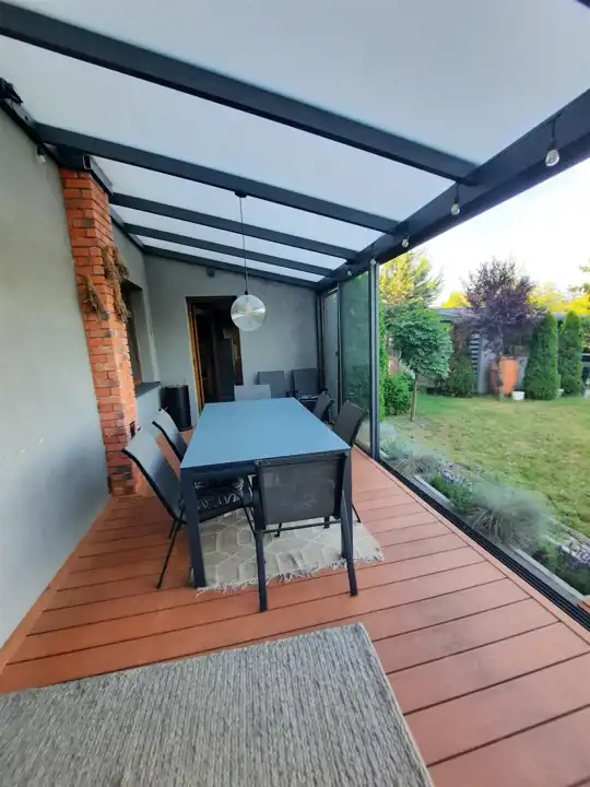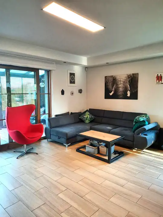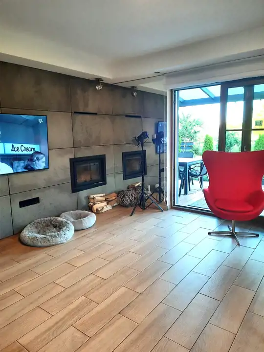 . pokój dzienny z kominkiem; bardzo dobrze doświetlony ,z dużymi przesuwnymi oknami ; z pokoju dziennego wyjście na zabudowany przeszklony i zadaszony taras o pow. 27 m.2,wyłożony deską kompozytową.