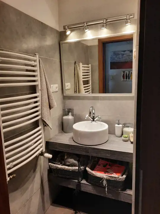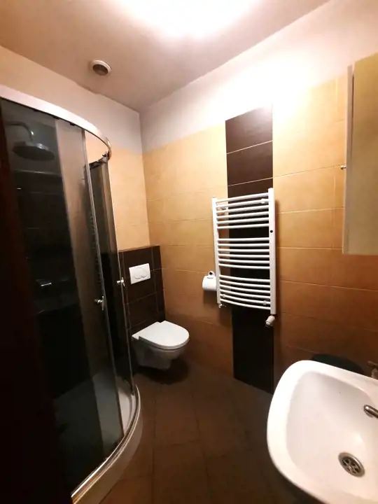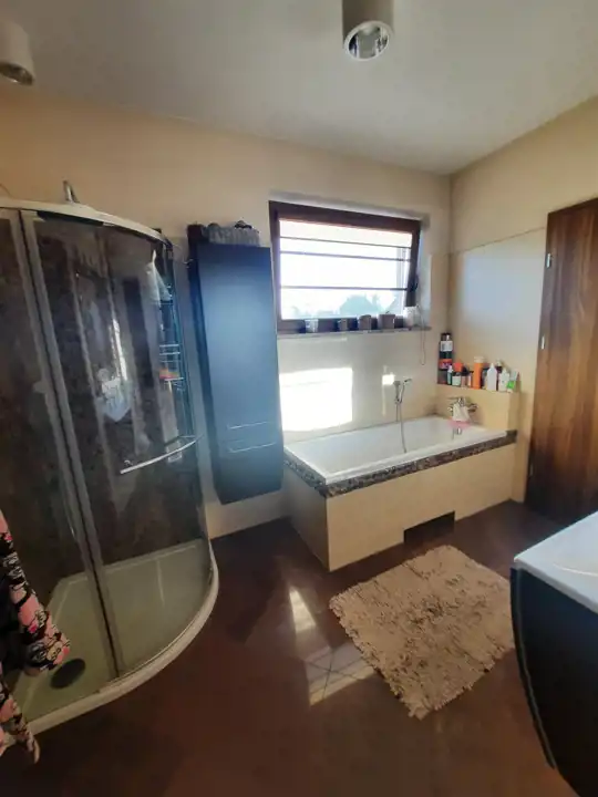 . łazienka z wanną, kabiną prysznicową, wc, umywalką. Bezpośrednio do łazienki przylega pralnia