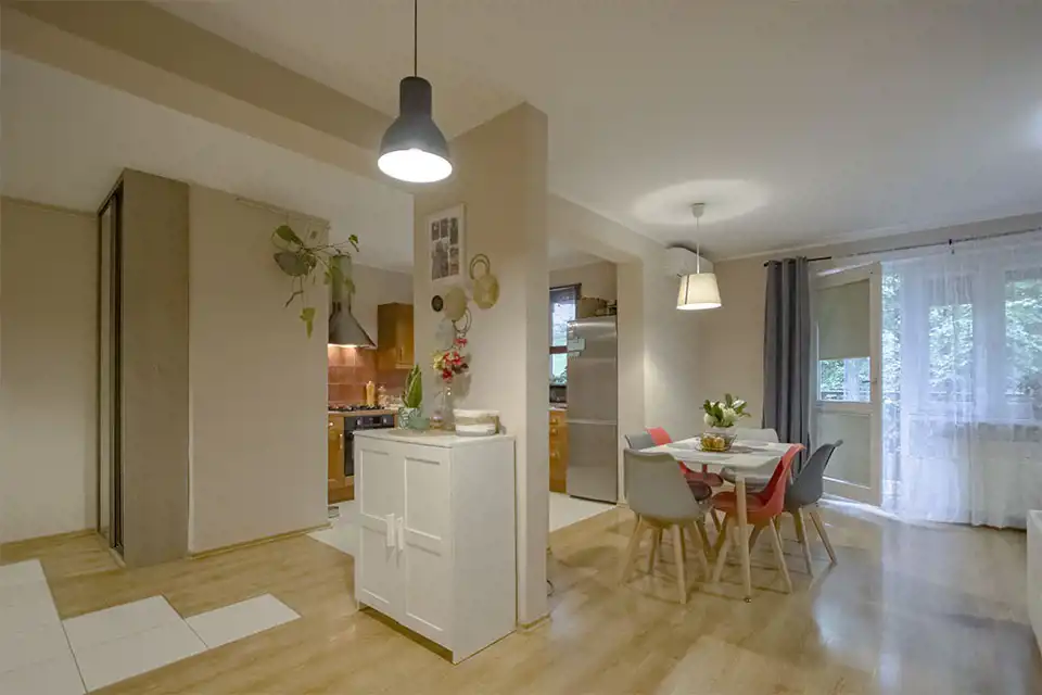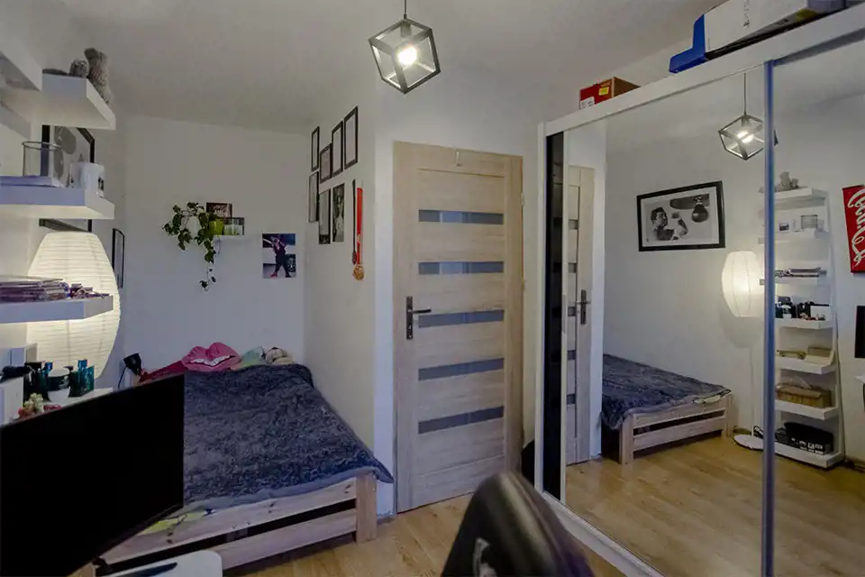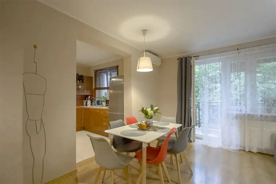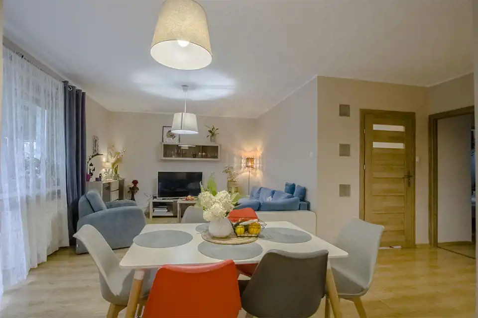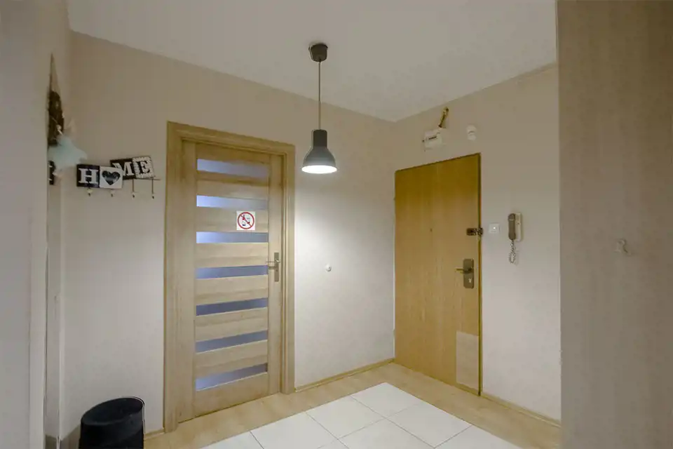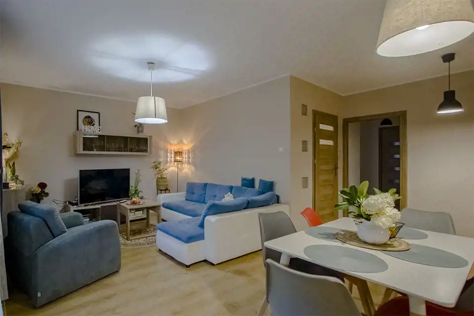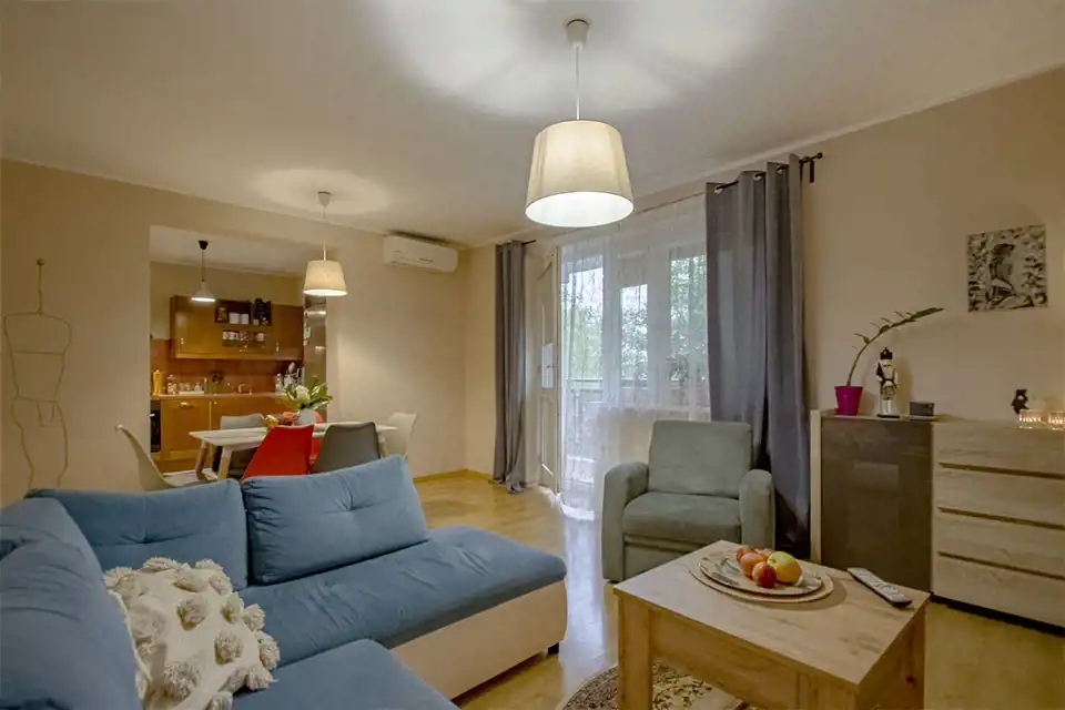 - Mieszkania składa się z aneksu kuchennego połączonego z salonem z wyjściem na balkon (w kuchni pełne wyposażenie: meble, zmywarka, lodówka z zamrażarką, płyta gazowa, piekarnik, okap), przedpokoju, 3 sypialni oraz łazienki z wanną. Na podłodze w pokojach panele podłogowe, natomiast w kuchni, przedpokoju oraz łazience gres. Mieszkanie wykończone w lekkim, nowoczesnym stylu, w jasnych i ciepłych kolorach. W mieszkaniu została zamontowana klimatyzacja.