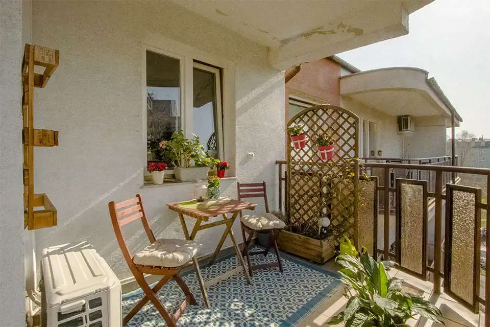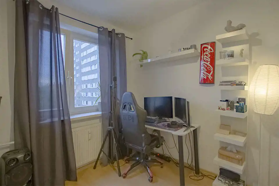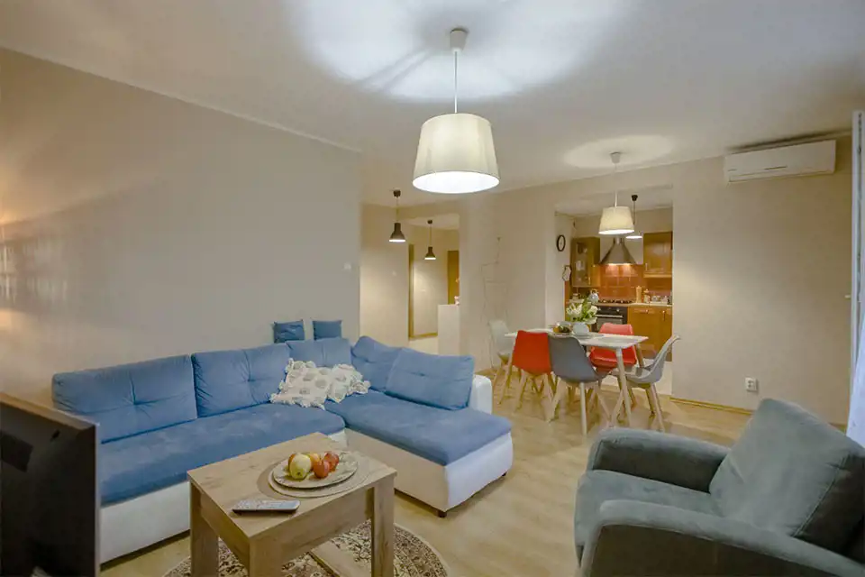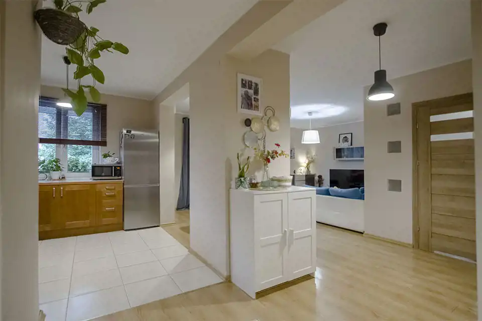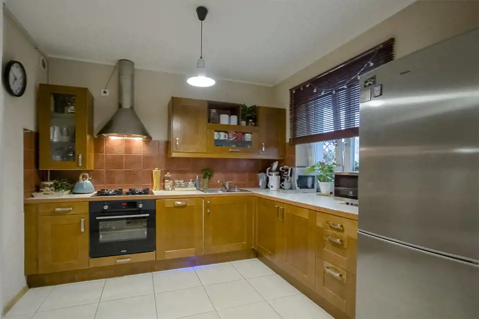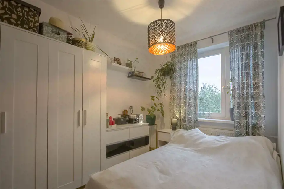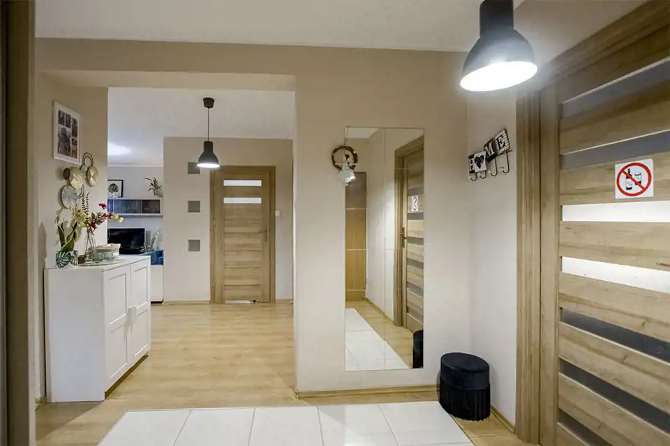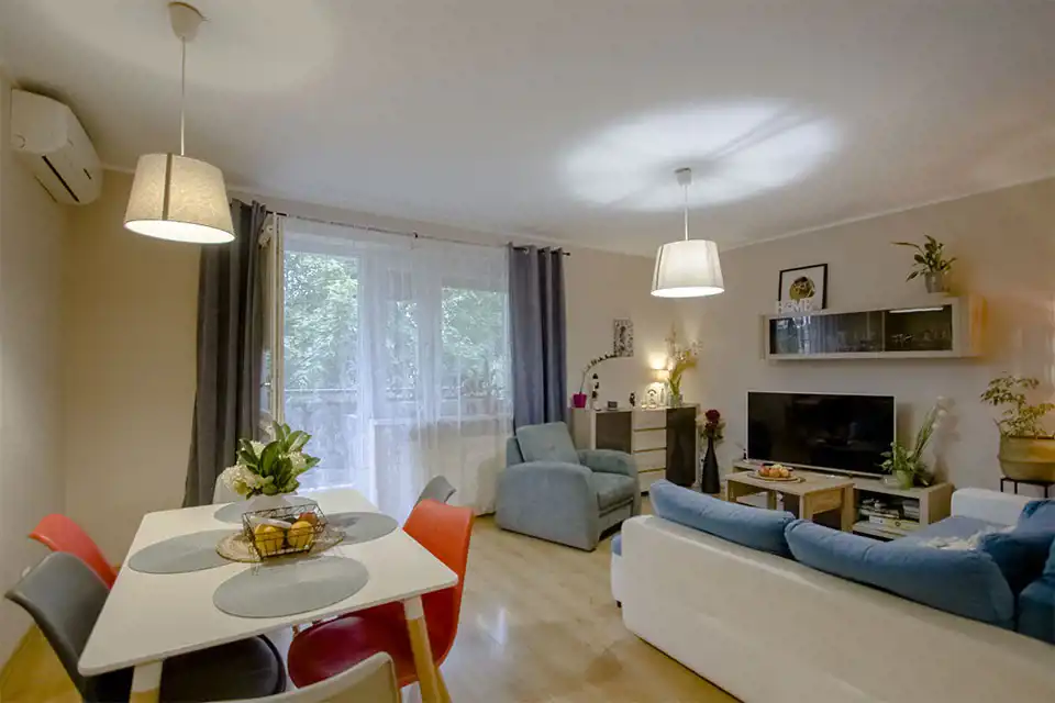 - Mieszkania składa się z aneksu kuchennego połączonego z salonem z wyjściem na balkon (w kuchni pełne wyposażenie: meble, zmywarka, lodówka z zamrażarką, płyta gazowa, piekarnik, okap), przedpokoju, 3 sypialni oraz łazienki z wanną. Na podłodze w pokojach panele podłogowe, natomiast w kuchni, przedpokoju oraz łazience gres. Mieszkanie wykończone w lekkim, nowoczesnym stylu, w jasnych i ciepłych kolorach. W mieszkaniu została zamontowana klimatyzacja.