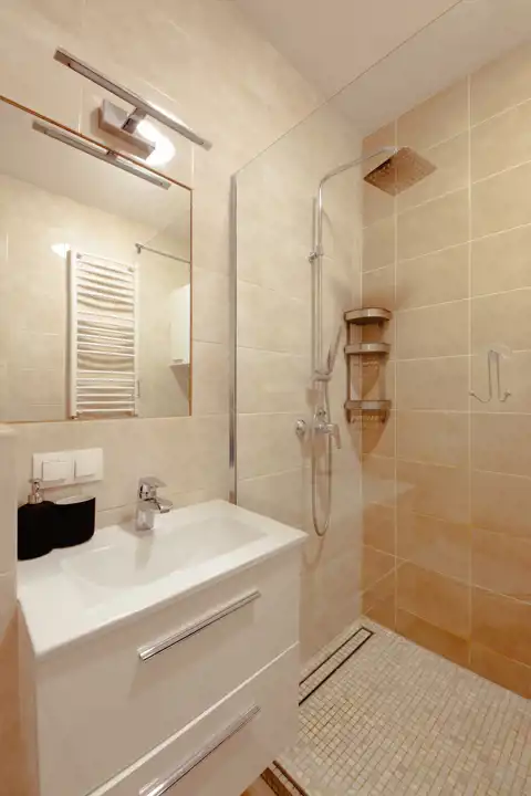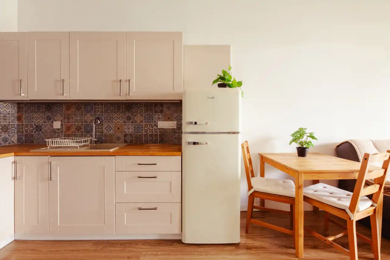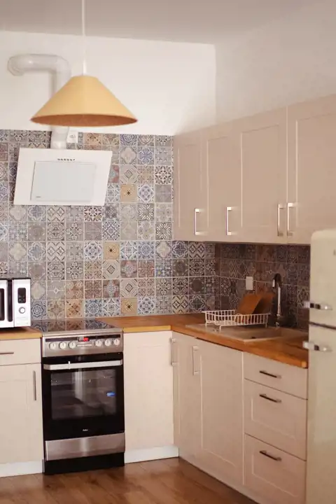 Kuchnia wyposażona w sprzęt AGD (lodówko- zamrażarkę, piekarnik, płytę indukcyjną, okap). Łazienka z kabiną prysznicową zabudową łazienkową oraz pralką.