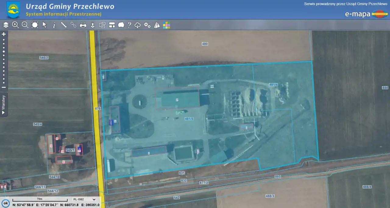- Działka 481/5 (2,9900 ha): Użytkowanie wieczyste. Studium uwarunkowań i kierunków zagospodarowania przestrzennego przewiduje tereny zabudowy produkcyjnej i produkcji rolnej (możliwość prowadzenia działalności przemysłowej, chemicznej, technologicznej, logistycznej, usługowej, magazynowej).