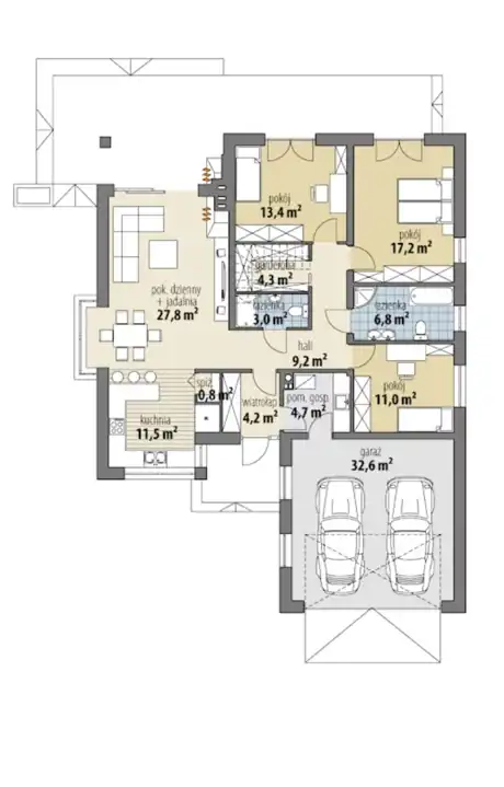 Warto dodać, że istnieje możliwość adaptacji poddasza, co stwarza dodatkowe możliwości aranżacyjne. Dom z dużym tarasem i imponującymi przeszklonymi drzwiami tarasowymi zapewnią doskonałe doświetlenie wnętrz i płynne połączenie z ogrodem - idealne miejsce na relaks i spotkania z bliskimi.