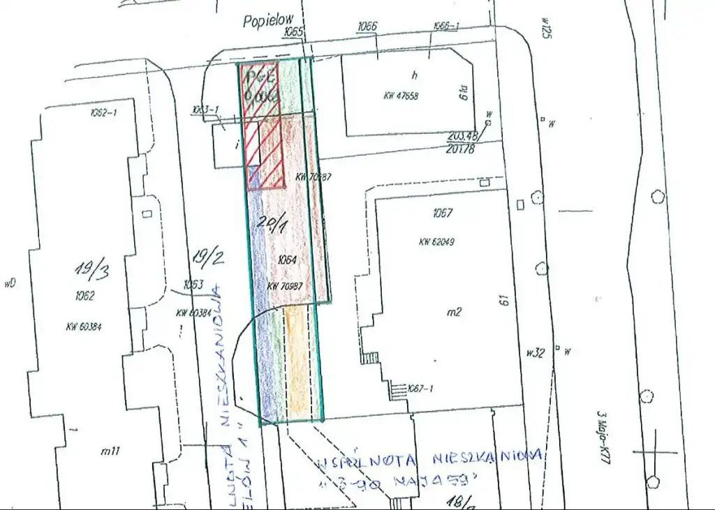 Działka nr 1064 składa się z gruntów zakwalifikowanych jako tereny mieszkaniowe B -265,00m2 oraz tereny przemysłowe Ba - 9,00m2, natomiast działka nr 1065 w całości zakwalifikowana jako tereny mieszkaniowe.